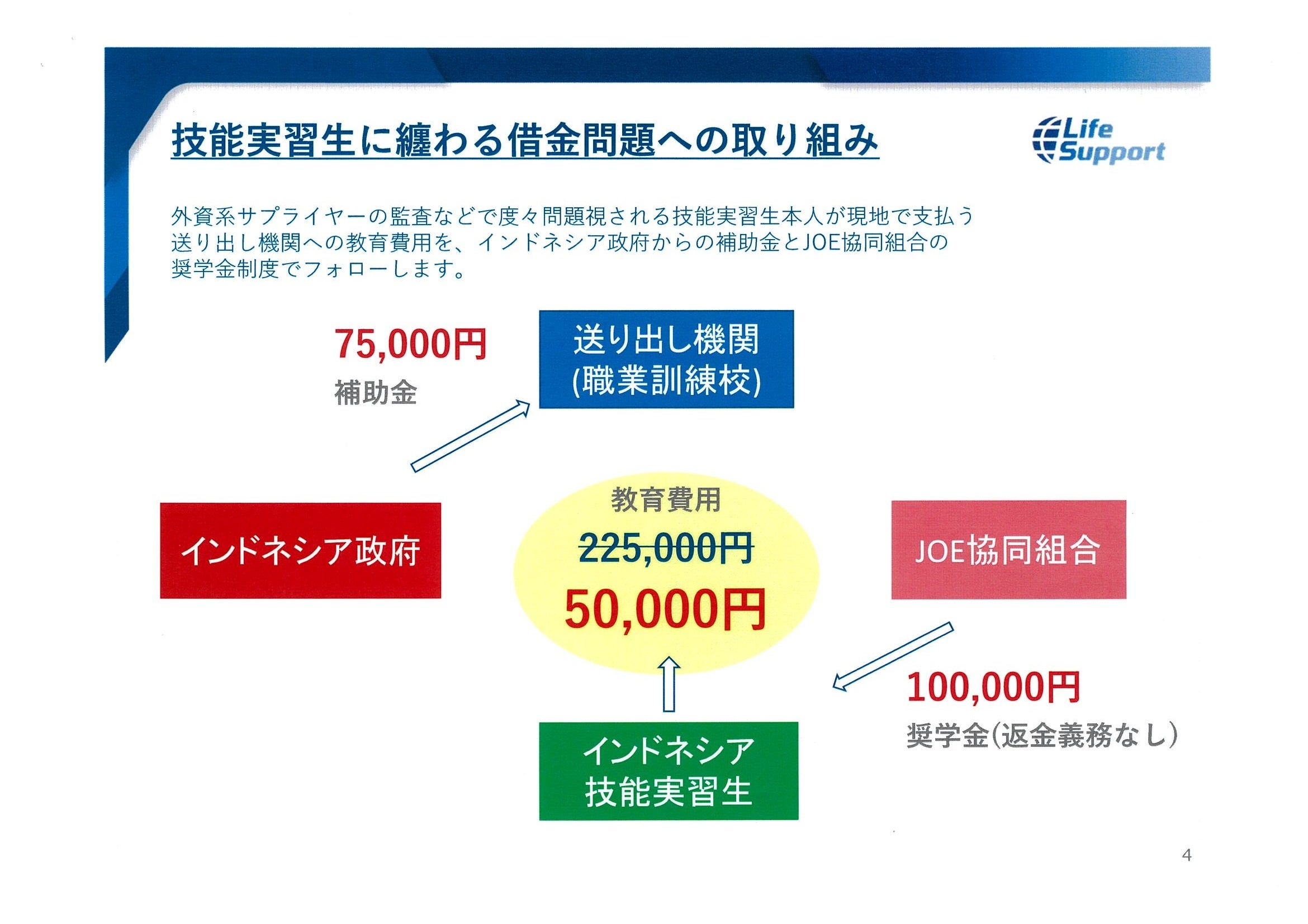 インドネシア政府は若年層の雇用問題の解決策として、インドネシア国内での就業を目的として運営されていた国営の就業訓練校で日本語教育を実施し、卒業後は技能実習生として日本企業で就業できるようJOE協同組合と今回のプロジェクトを締結しました。実習生たちの金銭的負担を最小化するべく、インドネシア政府からは実習生一人当たり7万5千円の補助金が拠出されることに加え、JOE協同組合からは返済義務のない奨学金10万円が給付され、実習生の日本での就業をサポートします。