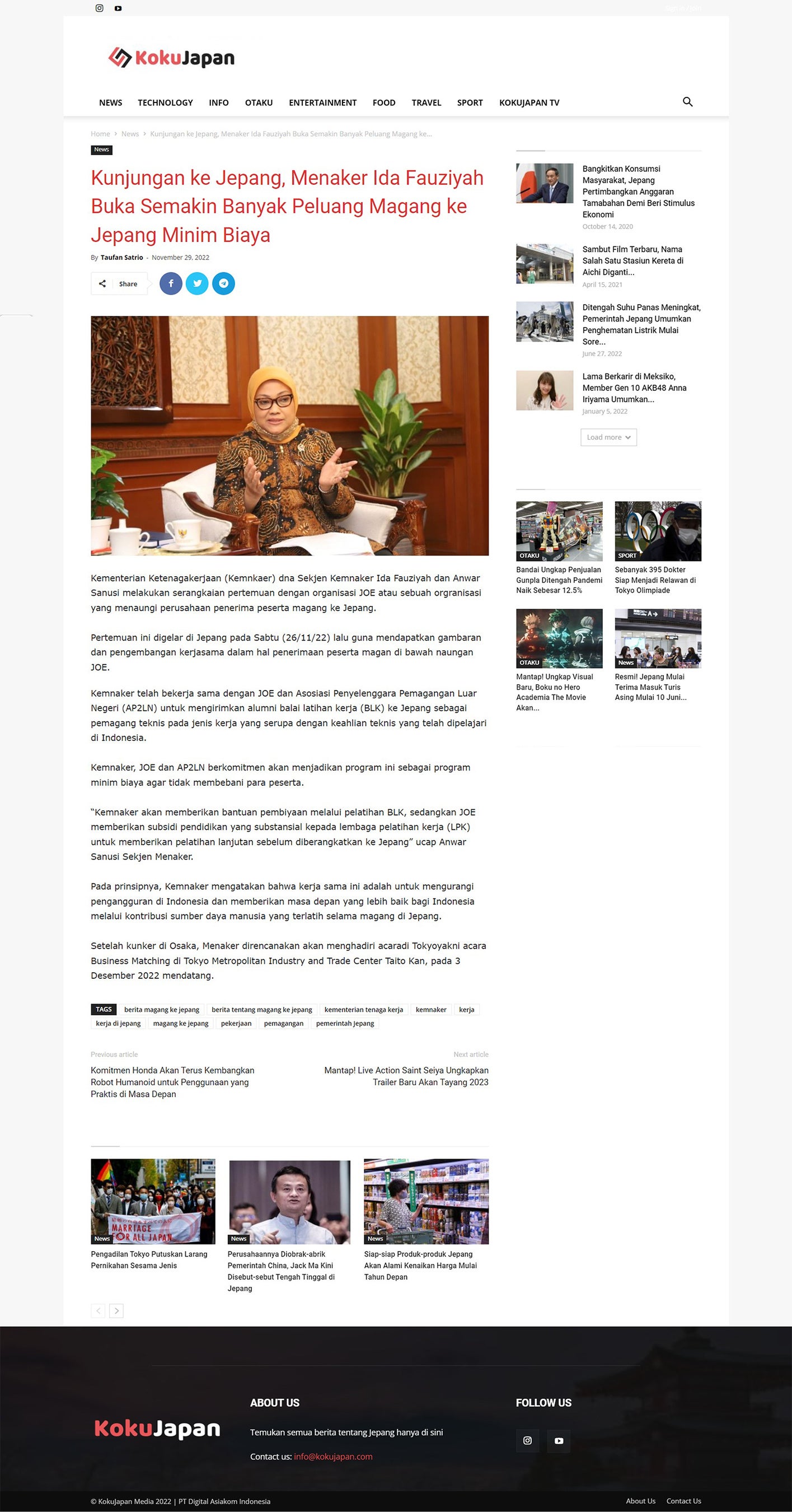 インドネシアで日本に関するニュースを発信するwebメディア『Koku Japan』は、視察後に行われた会議でイダ・ファウジヤ労働大臣が今回のプロジェクトに大きな期待を寄せていることを報じました。