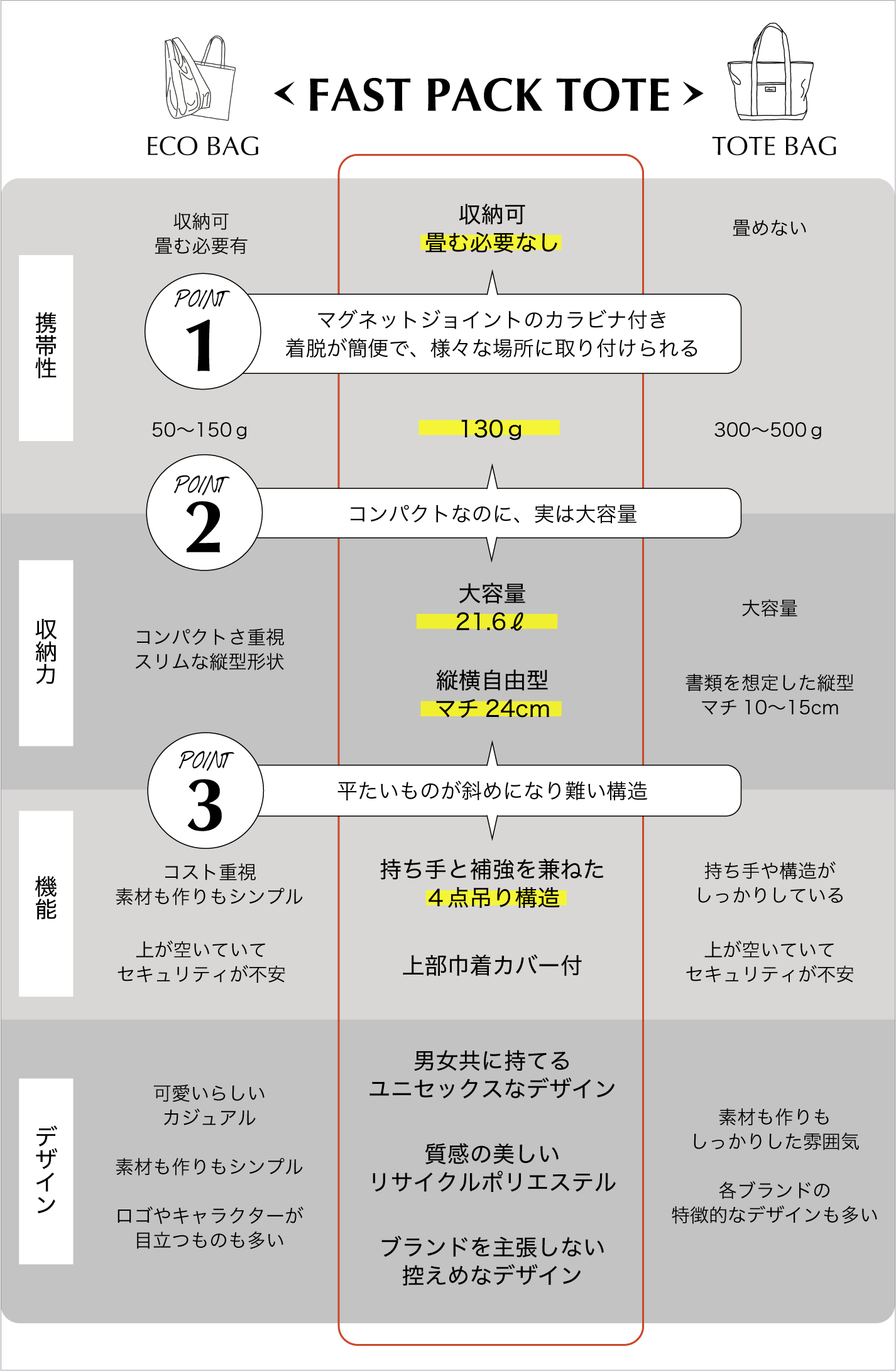 買い物に行くのがもっと愉しくなる 。とことん便利、そしてエコ。〈 FAST PACK TOTE 〉
