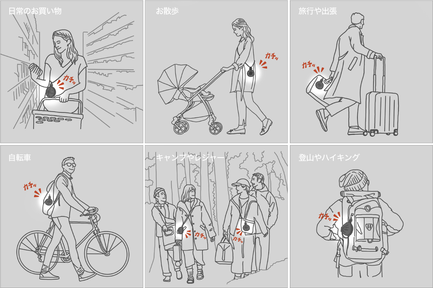 カラビナ付きのマグネットジョイントで、スタイルは自由自在。お手持ちのバッグやスマホショルダーに取り付けることもできます。着脱や出し入れの利便性が高く、サイズや形状も使いやすい。