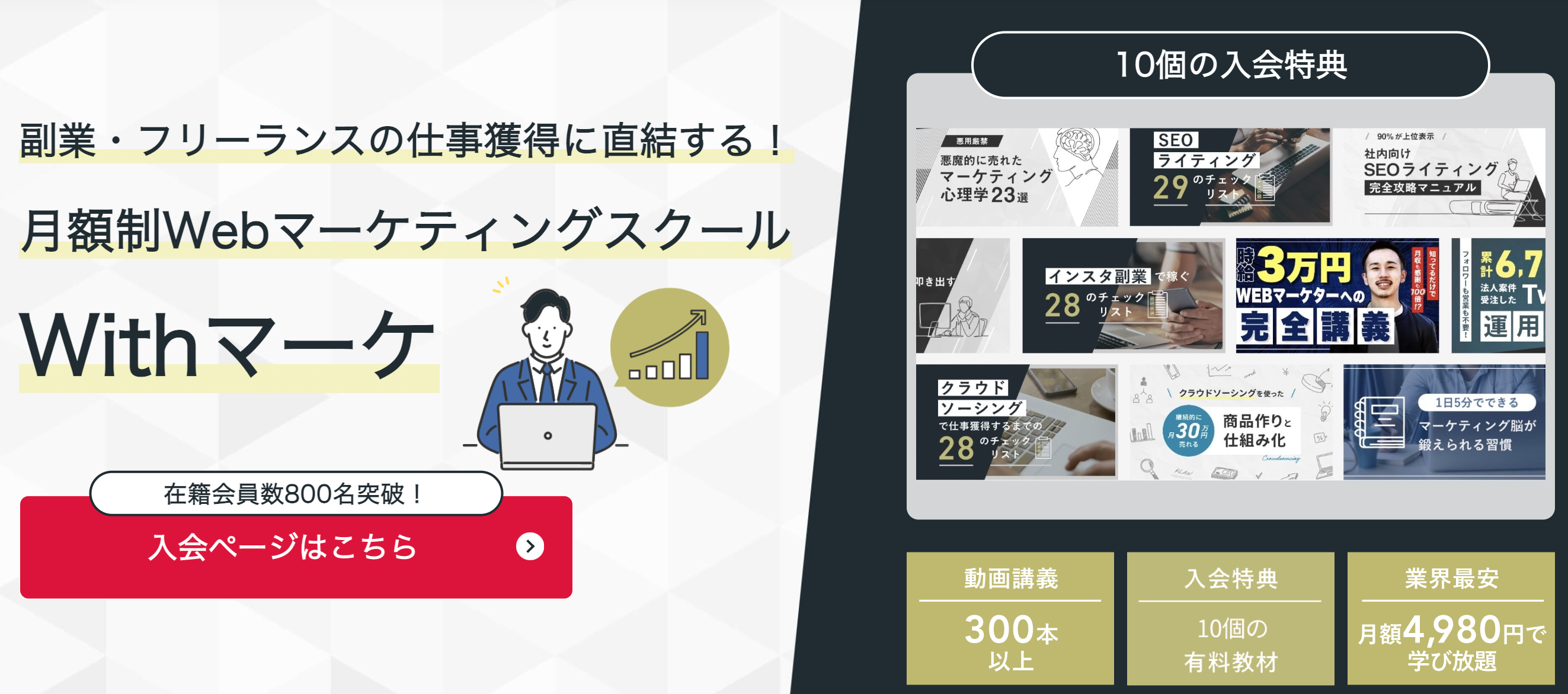 だからこそ、私たちは、副業・フリーランスの仕事獲得や収入UPを目的に、月額制Webマーケティングスクール「Withマーケ」を立ち上げました。