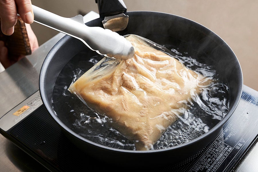 袋のままたっぷりの熱湯に入れ、白い脂が溶けるまでそのまま鍋の中で温めてください。(10~15分程度)