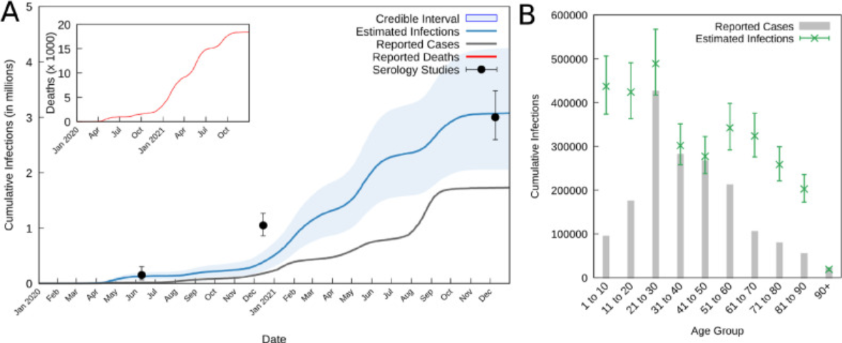 ぞれ報告された累積感染者数と死亡者数を示す。3つの血清疫学調査(黒丸)により、結果を検証した。