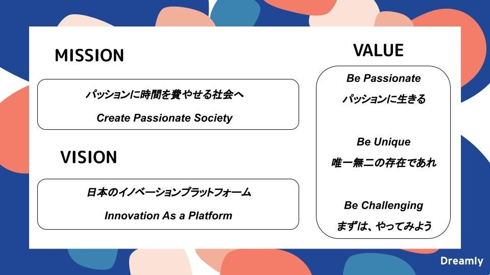そのためDreamlyは、人材育成とインスピレーション、経験とノウハウを提供できる「日本のイノベーションプラットフォーム」を目指すことをビジョンに掲げています。