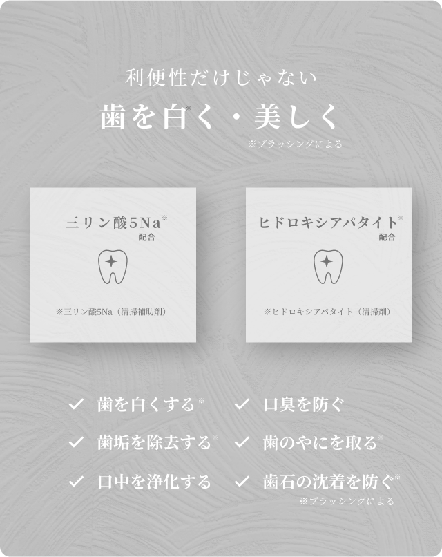 利便性だけでなく、ヒドロキシアパタイト※1、三リン酸5Na※2が歯の付着汚れを取り除き、歯を白く美しく※3します。