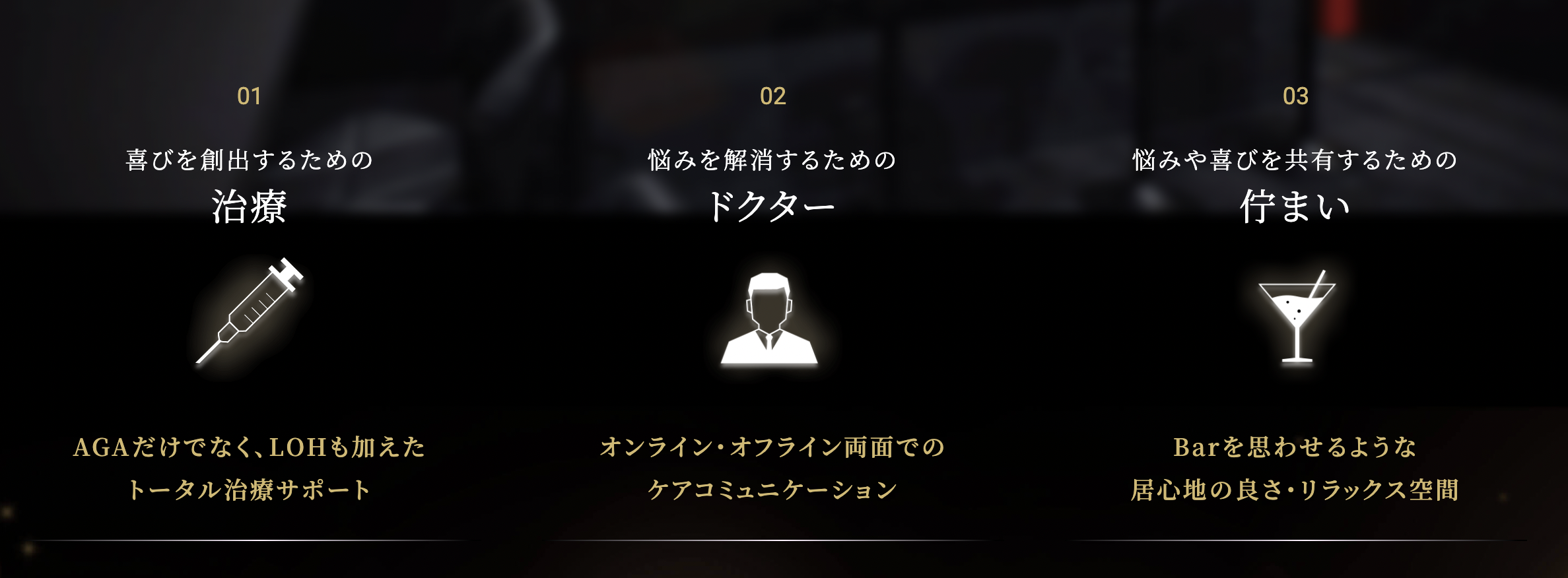 もう、このような悩みを一人で抱え続ける必要はありません。Dr.Black AGAでは、次にあげる3つのサービスを武器に、薄毛に悩みを抱える皆さまを徹底してサポートいたします。