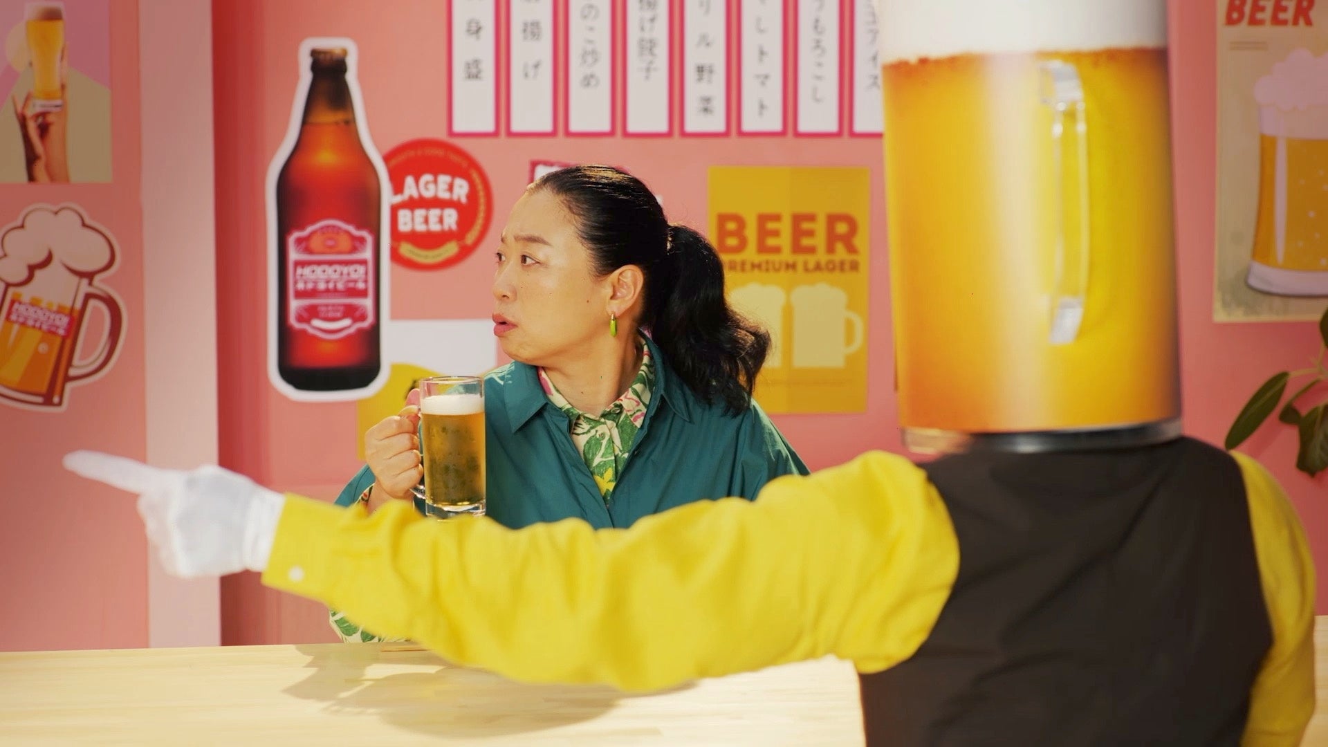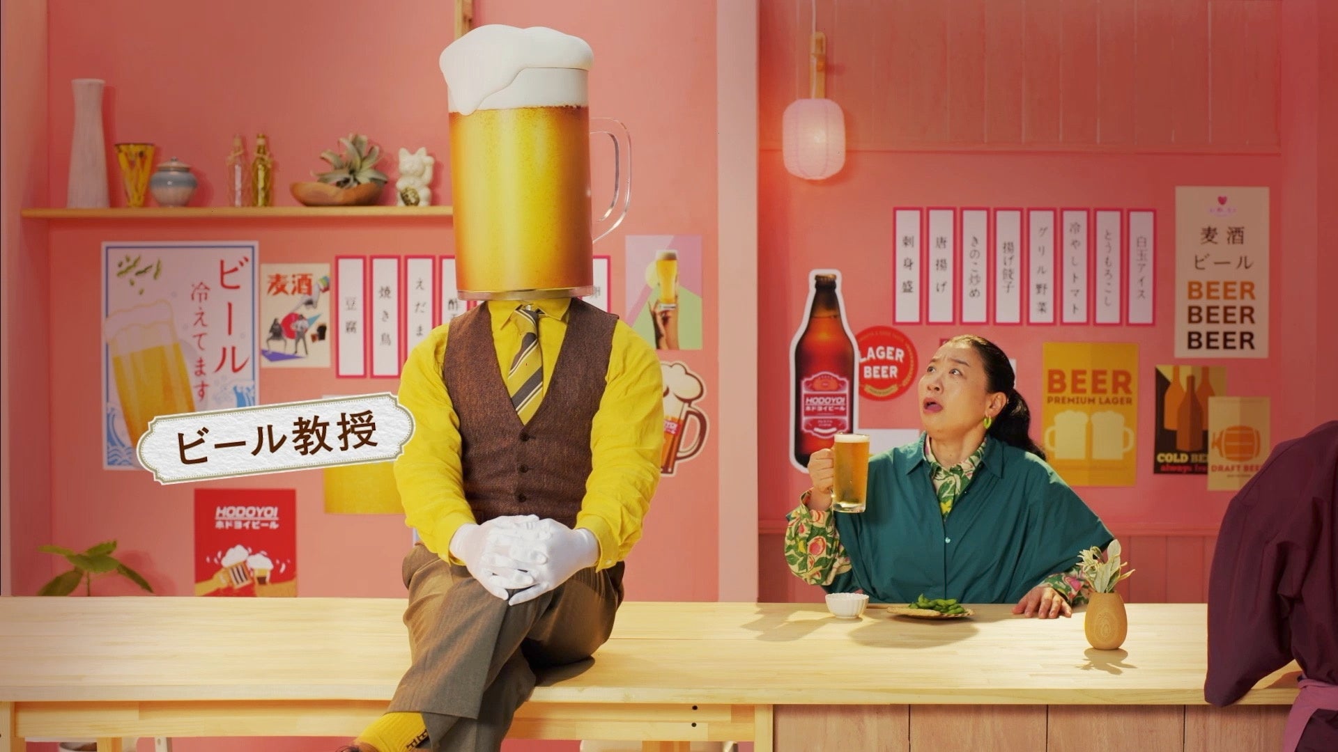 居酒屋で満面の笑みでビールを飲んでいるいとうあさこさん。そこに登場したのが頭がビールジョッキのビール教授。いとうさんに「ちゃんと、ほど酔いしてるかい?」と尋ねながら、同じ居酒屋の中に見て欲しい人がいると提案されます。