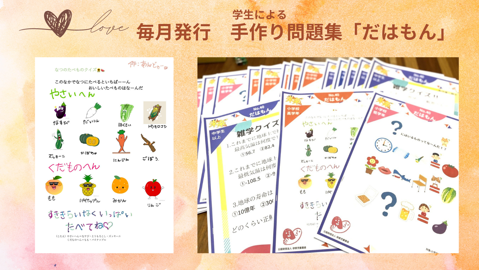 病床でも楽しめるゲームをしたり、親しみやすいお手製の問題集「だは(^^)もん」をお届けして、学習・復学を支援したりしています。
