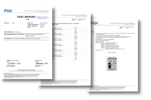 FITI試験研究所では「SonicSprayer」で生成された次亜塩素酸水を6種類の菌に対して噴霧、30秒後に除菌が完了していることを検証しています。
