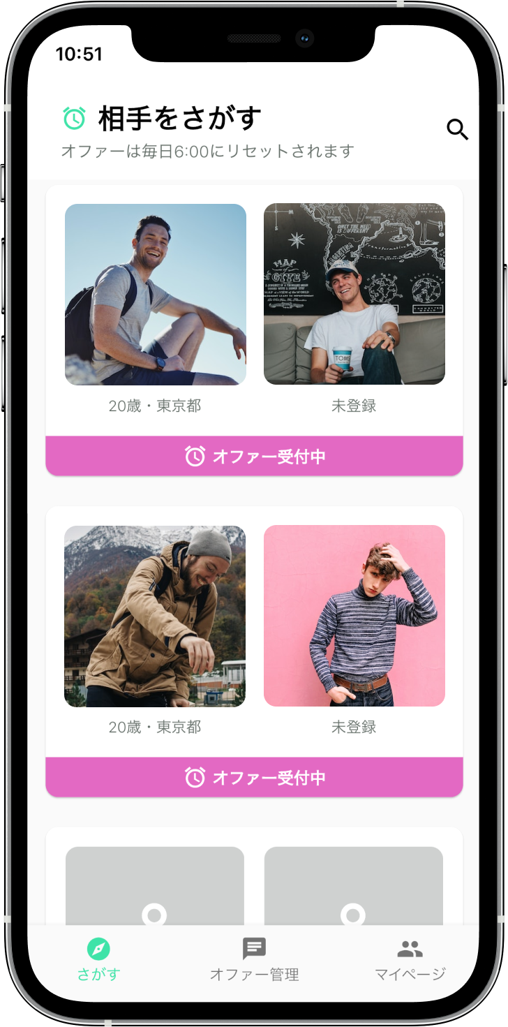 アポモは2対2の出会いに限定する事で、気の知れた人と一緒に使える「安心感」と出会いまでの煩わしさを排除した「スマートな出会い」を両立させるようなユーザー体験を実現しました。