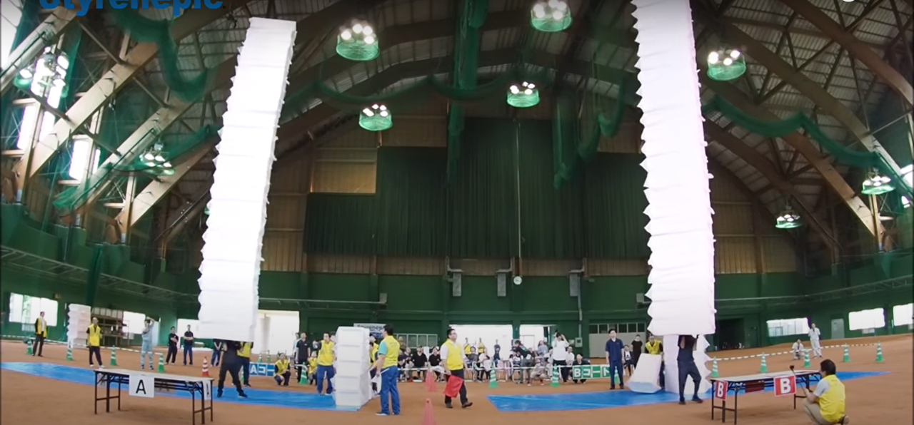 一見簡単そうに見える発泡スチロールの積み上げも、10段、20段なると、僅かなミスが倒壊に繋がり、集中力と繊細なバランス感覚が必要とされます。また競技ゆえスピードも求められます。
