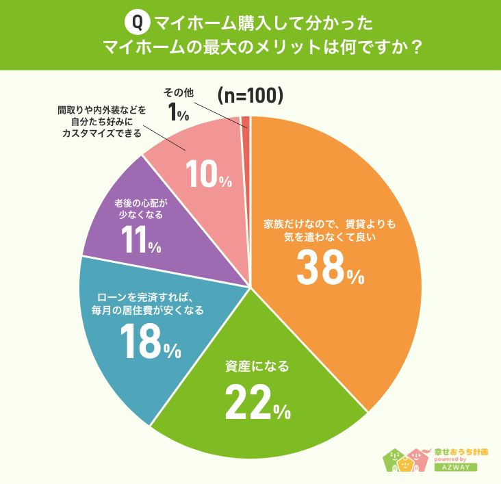 また、マイホームそのものが資産になったり、ローン完済後の負担が軽くなったりするといった、お金の面でもメリットを感じている方が多いようです。