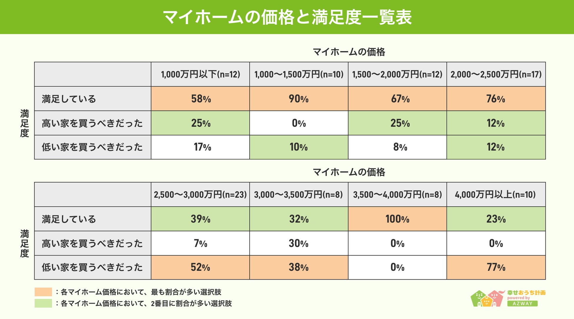 今回の調査では、2,500万円以下のマイホーム、3,500~4,000万円の満足度が高いことがわかりました。