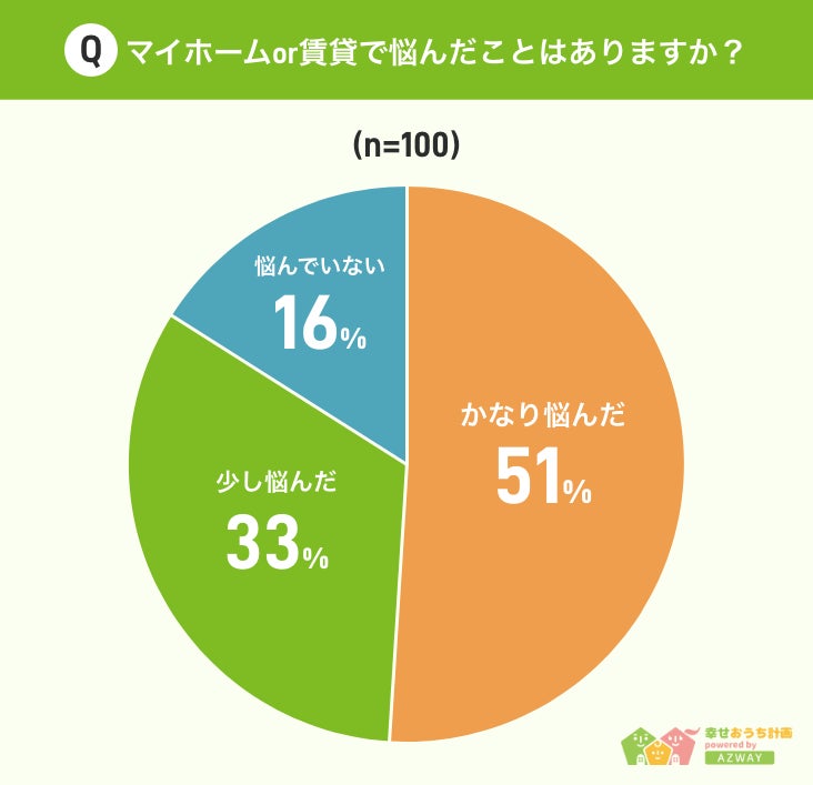 ■マイホームを建てた人の51%が「かなり悩んだ」、33%が「少し悩んだ」と回答。