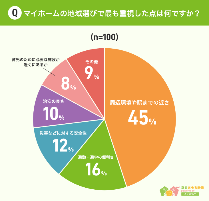 ■45%が「周辺環境や駅の近さ」、16%が「通勤・通学の便利さ」と回答。