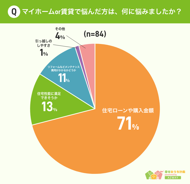 ■71%が「住宅ローンや購入金額に悩んだ」、13%が「住宅性能に満足できそうか」と回答。