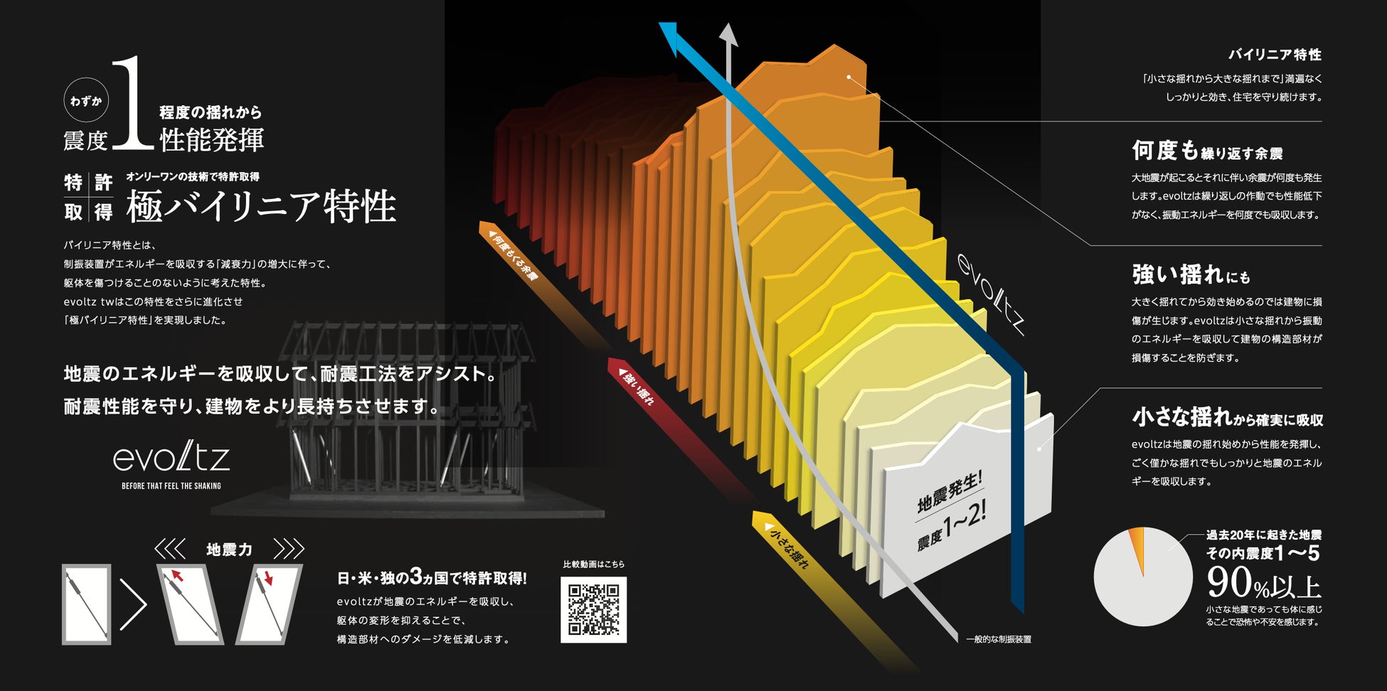 1. 「バイリニア特性」evoltz B5は震度1程度の小さな揺れから震度7の大きな揺れまで効果的に対応し、制振効果を最大限に発揮します。この性能をバイリニア特性と言い、木造住宅向けに小型化した製品を開発したことで特許を取得しました。