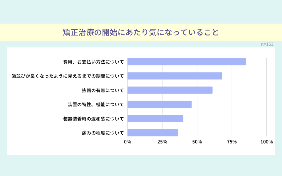 歯列矯正を始めるのに気になっていることは「費用・お支払方法について」85%「相手から見て歯並びが良くなって見える期間について」68%「抜歯の有無について」60%が上位を占める結果に。