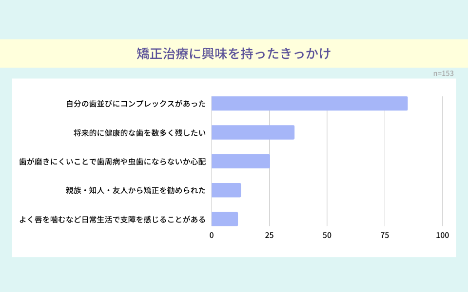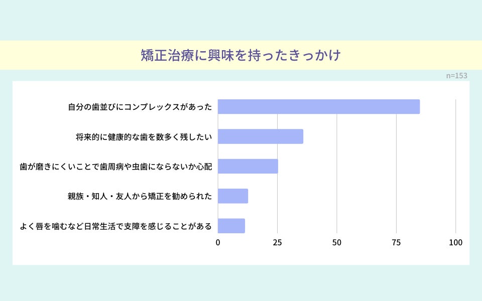 「歯列矯正に興味を持つようになったきっかけは「自分の歯並びにコンプレックスがあった」85%「将来的に健康的な歯を数多く残したい(そのために歯列を整え、歯磨きをしやすくしたい)」35%「よく磨きにくい歯がある・磨きにくいことがきっかけで歯周病や虫歯にならないか心配」26%が上位を占める結果となりました。