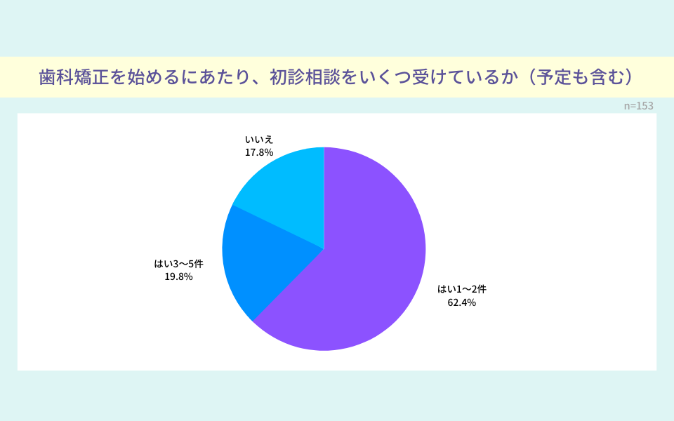 矯正歯科で初診相談を受けた後、他の矯正歯科でも相談をする人は80%以上という結果になりました。初回カウンセリングを受けたとしても、どの矯正歯科で治療するかを決めきれないようです。