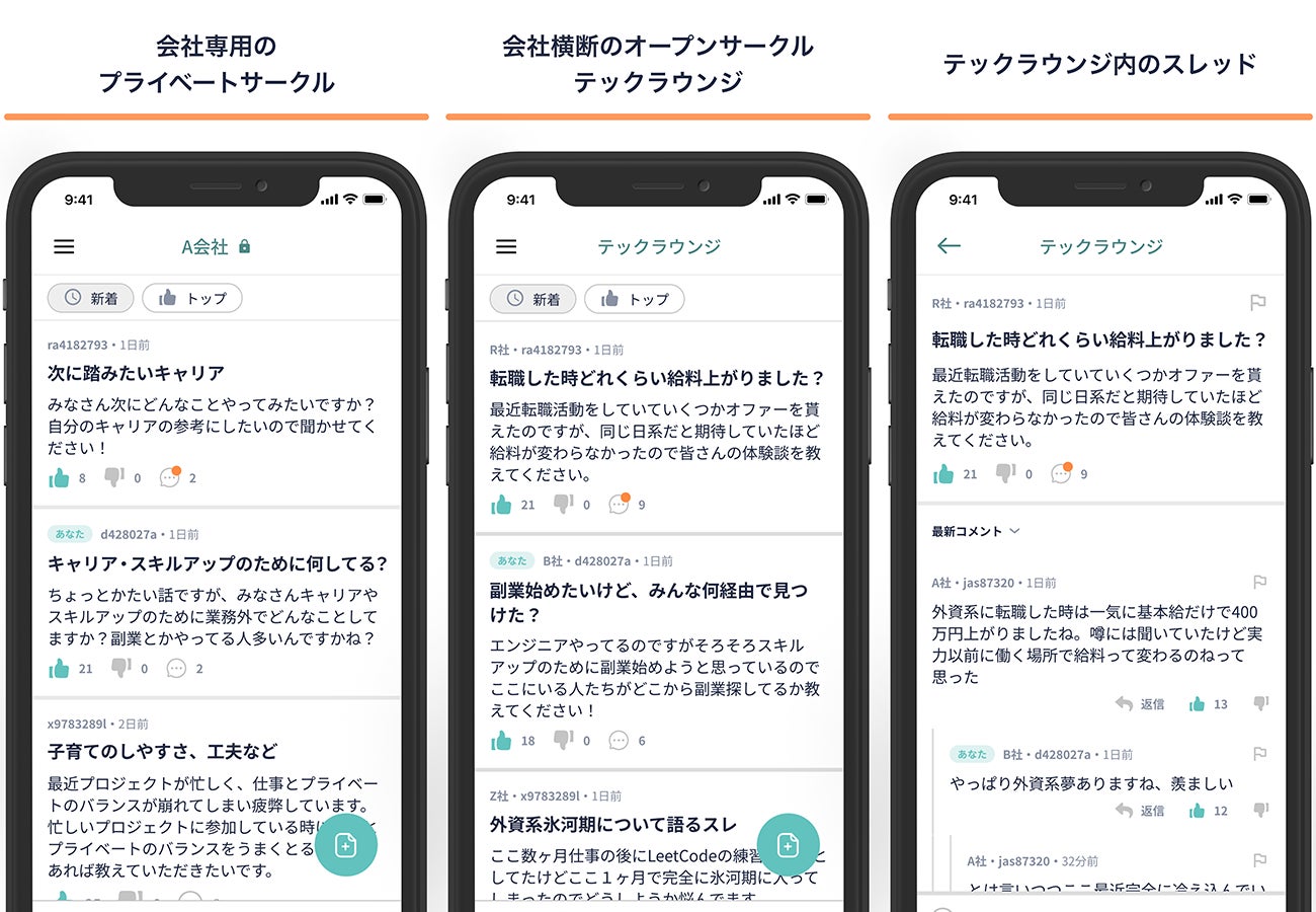 - プライベートサークル:同じ会社に勤務している社員のみが閲覧、投稿可能なチャットグループ。※匿名性を担保するために同じ会社から一定数のユーザー登録があり次第、自動的に公開されます。