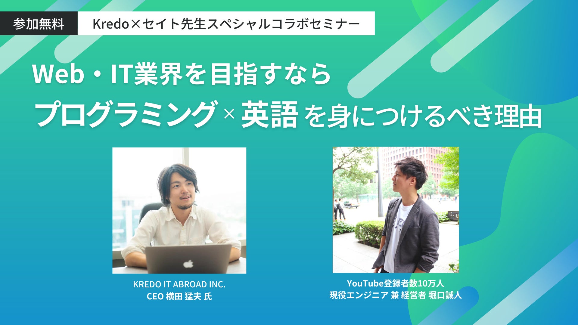 1,500名以上の卒業生を輩出、英語でプログラミングを学べるスクール「Kredoオンラインキャンプ」を運営しているKREDO JAPAN株式会社(所在地:東京都新宿区 代表取締役CEO:横田猛夫 以下:Kredo)は、YouTubeチャンネル登録者数10万人 現役エンジニア 兼 経営者 “セイト先生(堀口誠人氏)” との初コラボ企画「Kredo×セイト先生スペシャルコラボセミナー:Web・IT業界を目指すなら プログラミング × 英語を身につけるべき理由」を11月24日(木)に開催いたします。79万人のIT人材不足という課題を抱える日本で、今後活躍できるIT人材になるために必要なことについて、弊社CEO横田とスペシャルゲストのセイト先生による特別対談を実施。無料開催となっておりますので、プログラミングに少しでもご興味をお持ちの方は是非ご参加ください。