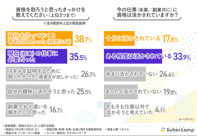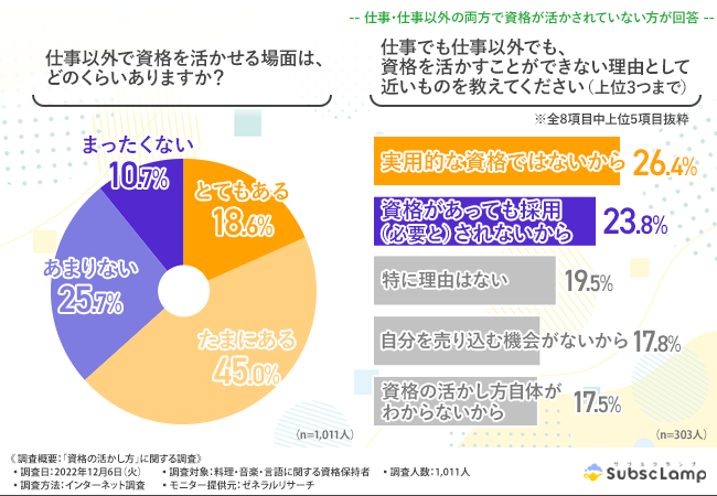 そこで今回、知識が無くても誰でも簡単にサブスクサービスを作れるWebソリューション『サブスクランプ』(https://subsclamp.com/)を運営する株式会社ストアフロントは、料理・音楽・言語に関する資格保持者を対象に、「資格の活かし方」に関する調査を実施しました。