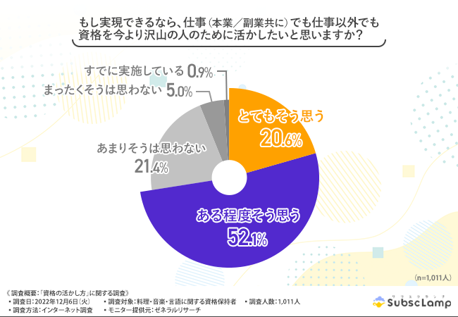 「もし実現できるなら、仕事(本業/副業共に)でも仕事以外でも資格を今より沢山の人の為に活かしたいと思いますか?」と質問したところ、7割以上の方が『とてもそう思う(20.6%)』『ある程度そう思う(52.1%)』と回答しました。