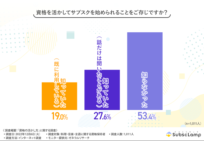 「資格を活かしてサブスクを始められることをご存じですか?」と質問したところ、『知っていた(既に利用している)(19.0%)』『知っていた(話だけは聞いたことがある)(27.6%)』『知らなかった(53.4%)』という回答結果になりました。