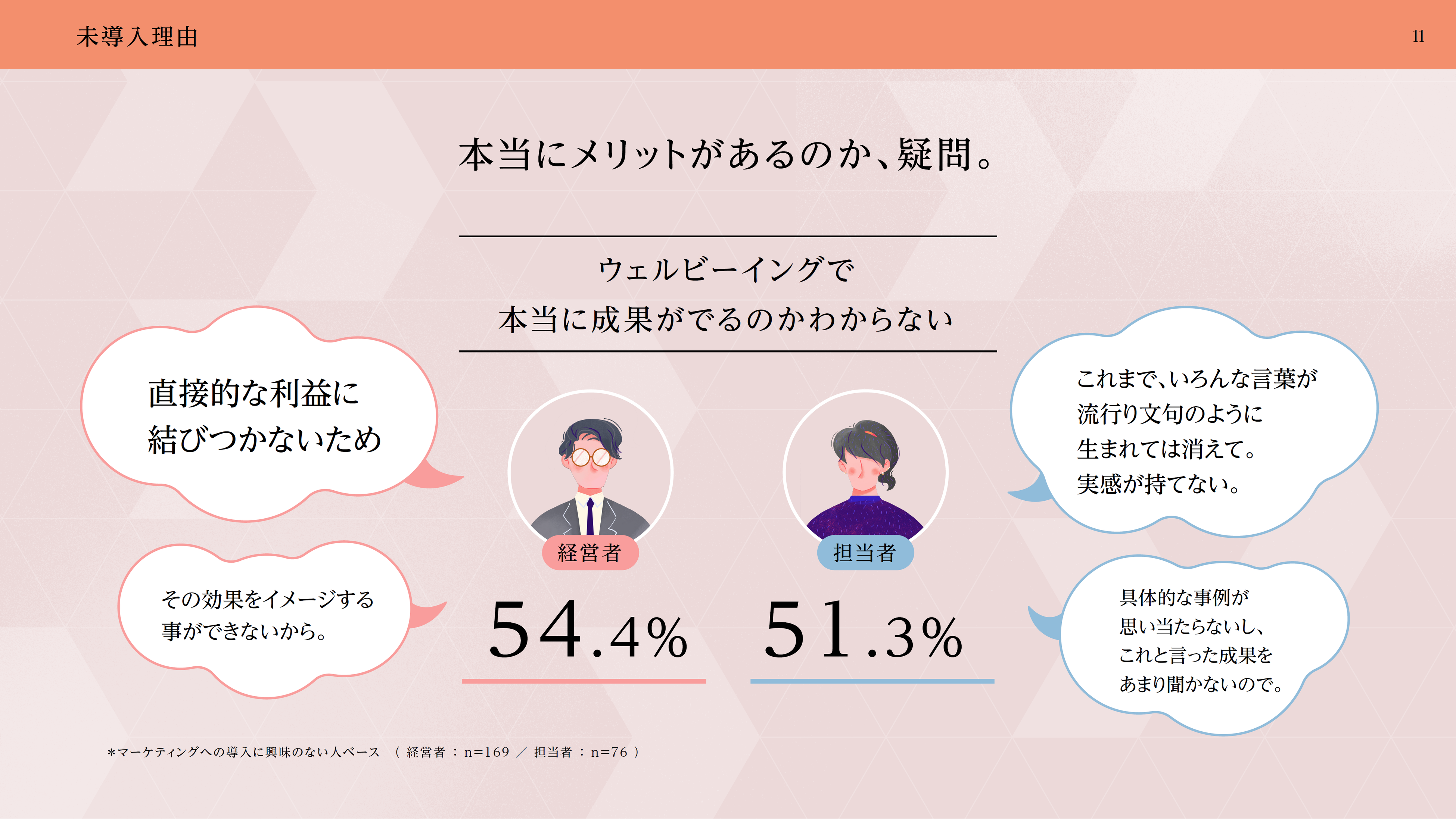 経営者・担当者は、ウェルビーイングに対して「心身の健康」「仕事・プライベートの両立」など様々な可能性を感じている一方で、実際にビジネスに導入しているのは3割程度。興味や関心があっても、「本当に成果が出るのかわからない」といった理由で様子見しているのが現状でした。