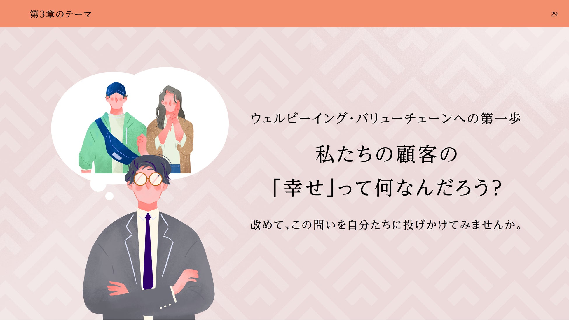 ウェルビーイングのマーケティング活用により、次々と幸せが繋がっていく「ウェルビーイング・バリューチェーン」を提唱。