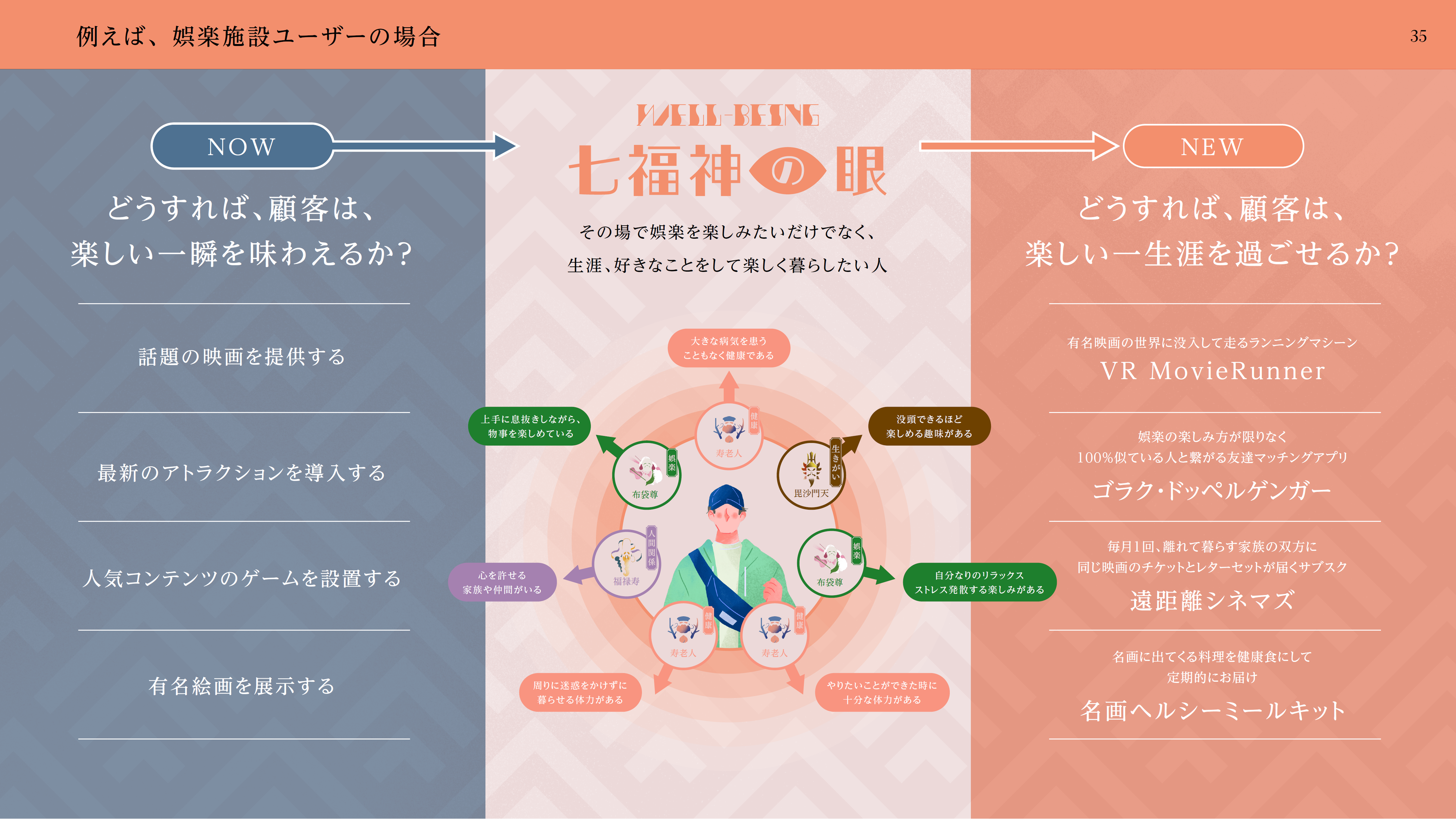 ウェルビーイングをビジネスに導入し、ポジティブな変化を連鎖させていくためにまず取り組むべきことは、「顧客の幸せを改めて考えること」です。顧客の多様な幸せを把握しなおすことで、顧客の意外な人間性が見え、ビジネスの新たなアイデアが見つかるきっかけになります。本レポートではオリジナル発想法「七福神の眼(スコープ)」を用いて、娯楽施設ユーザーと化粧品ユーザーの幸福観を捉えなおしたビジネスアイデアを公開しています。