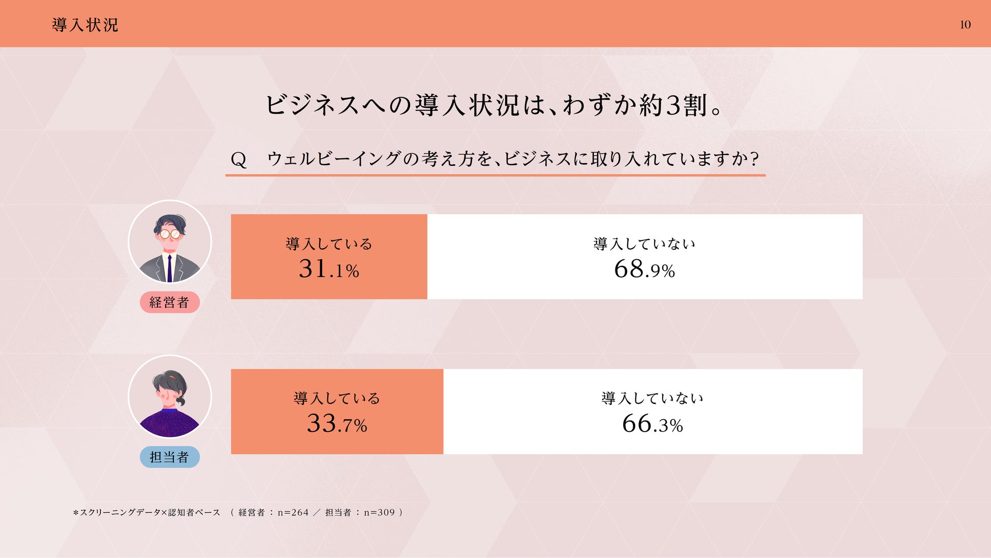 ウェルビーイングをビジネスに導入しているのは、認知者の3割程度。「本当にメリットがあるの?」