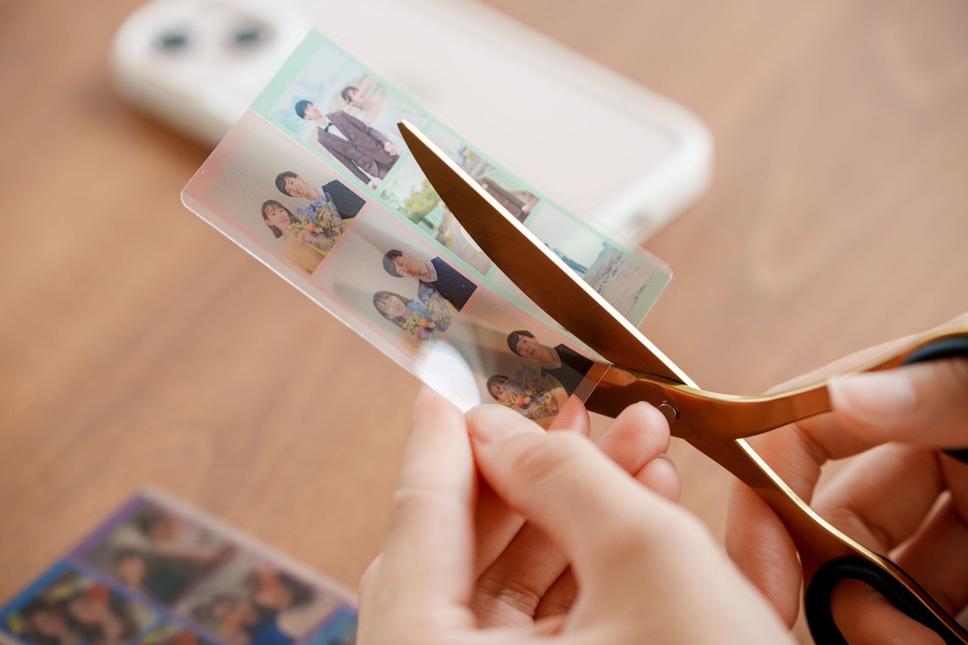 ハサミなどで簡単に切ることができます。友達とシェアしたり、スマホケースに入れたりすることができます。