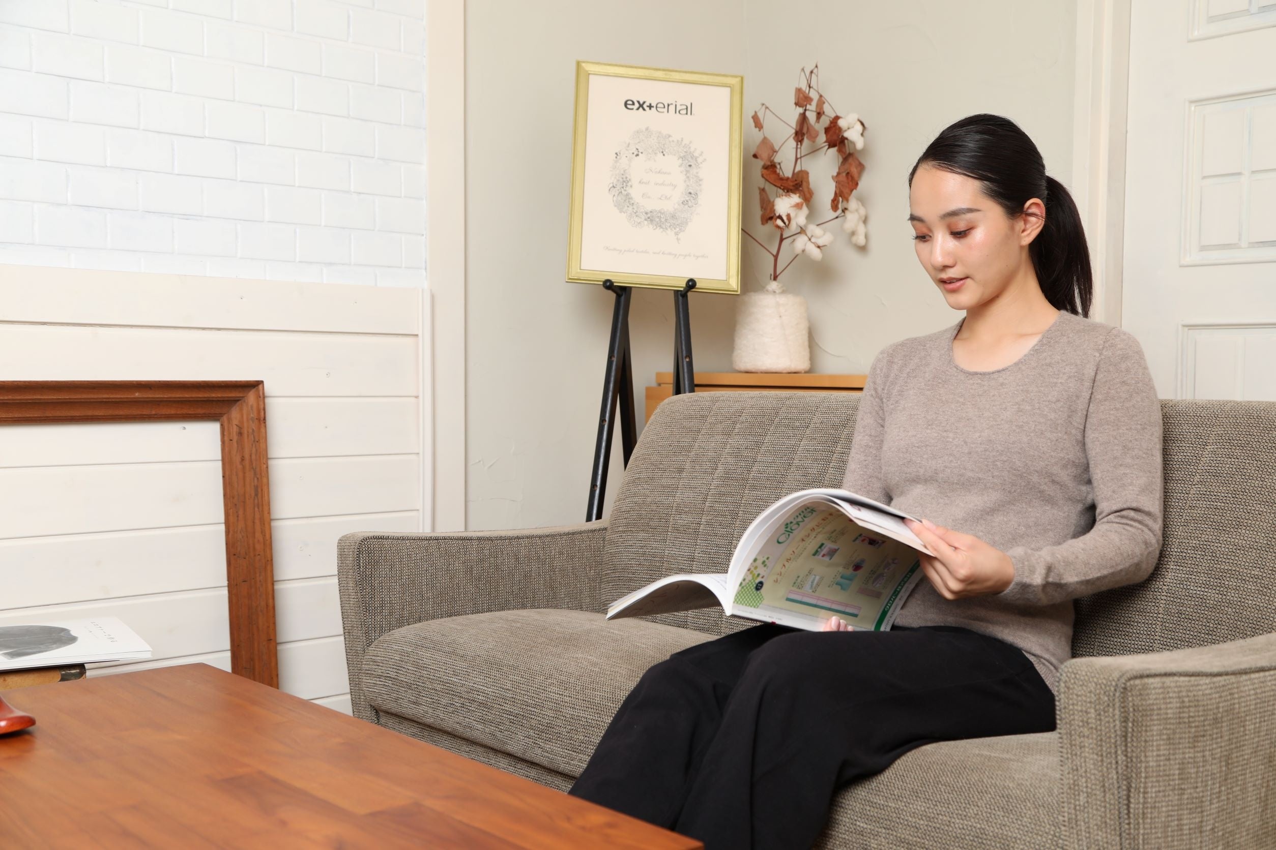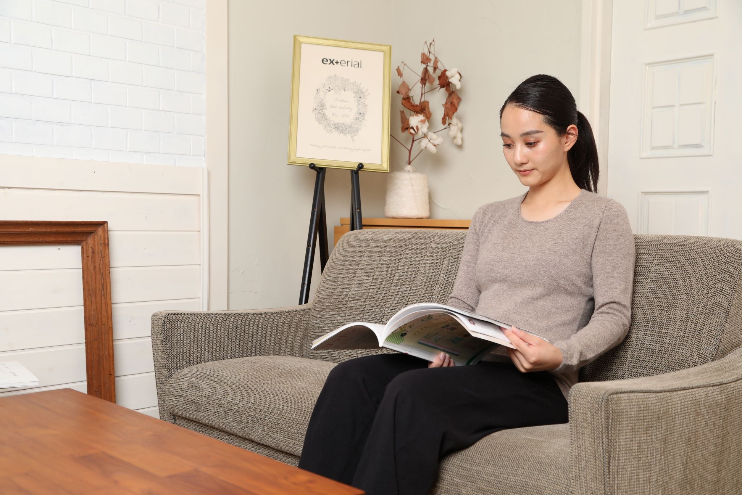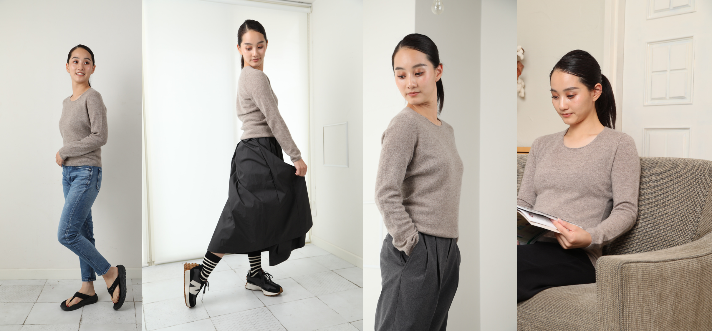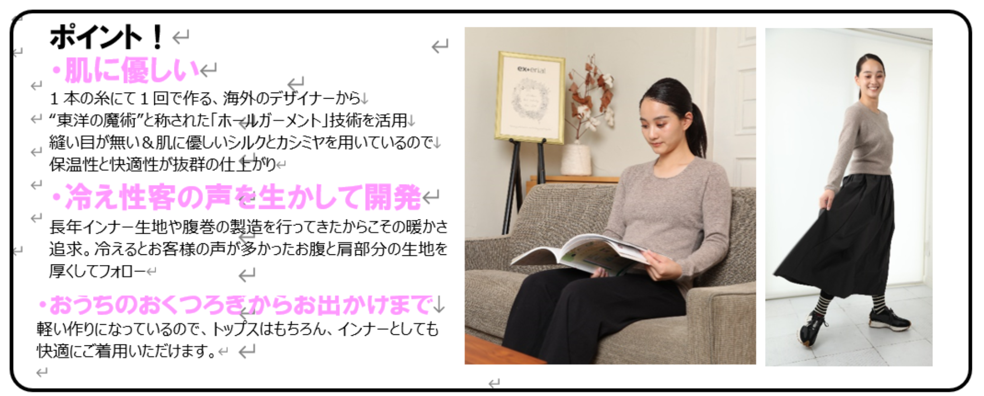 ・温活ニットにスカート、ワイドパンツでオフィスでも、デニムでカジュアルにも合わせられます。