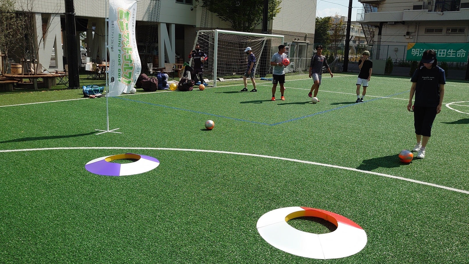 使用するボールも、サッカーボールに限らずゴムボールなどより軽いボールも使用可能ですし、コースレイアウトやルールも自由にアレンジできますので、プレイヤーの体力や目的に応じて様々な楽しみ方が可能となります。