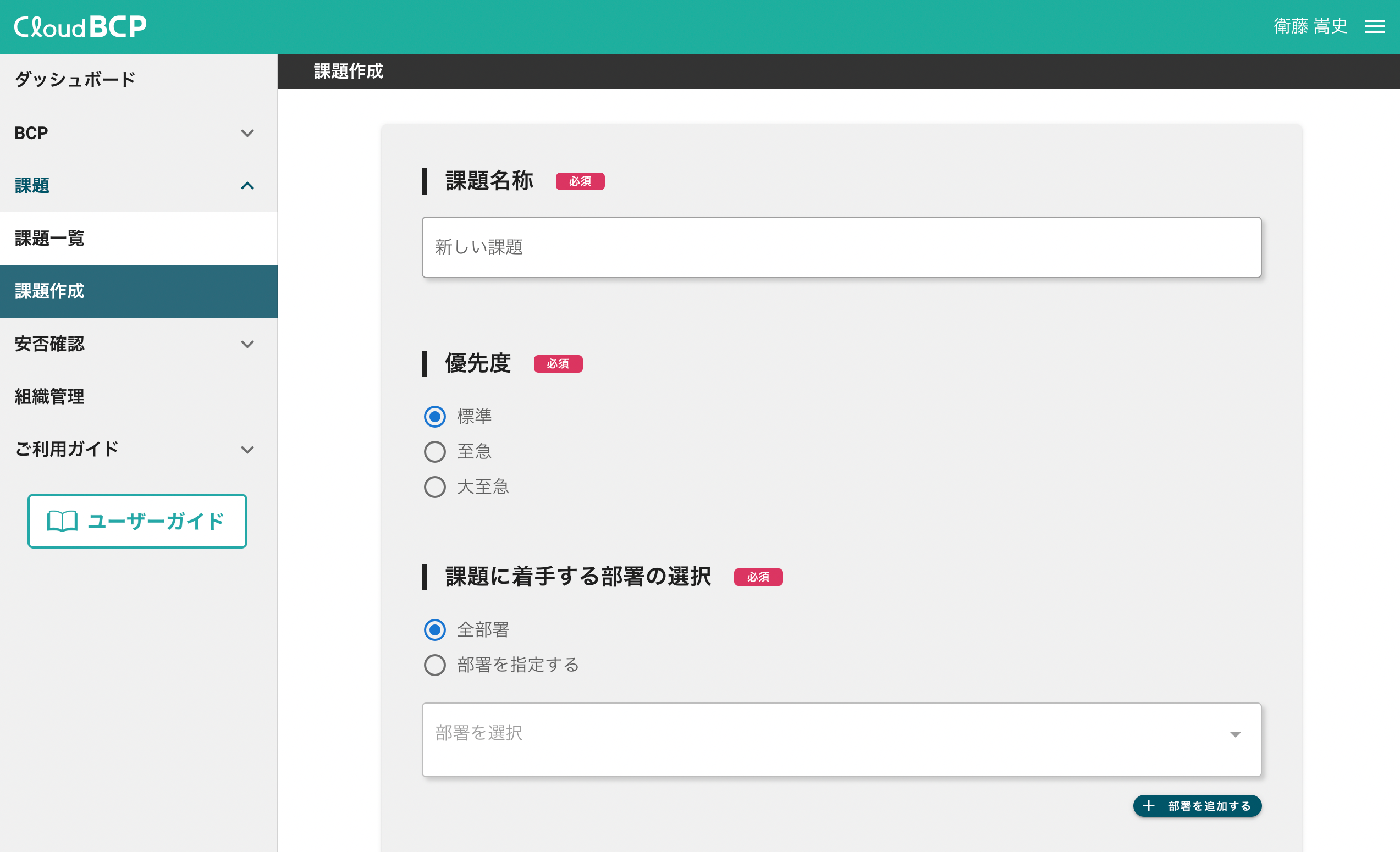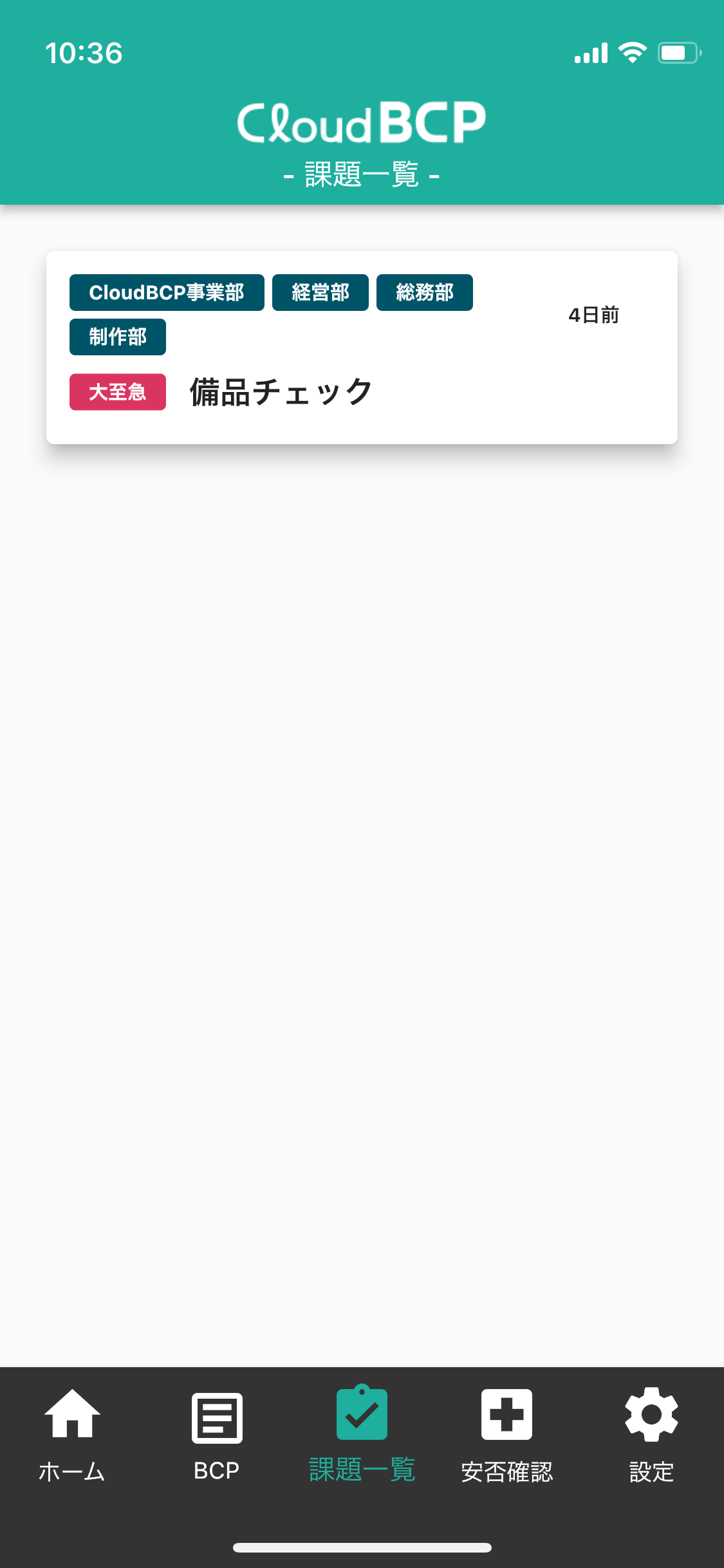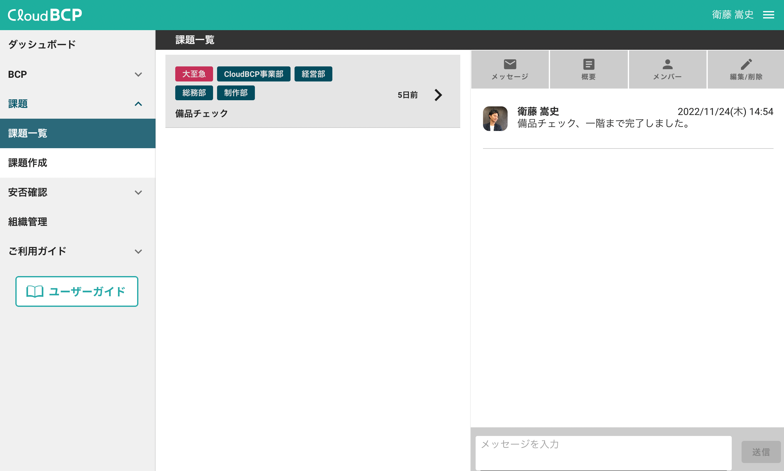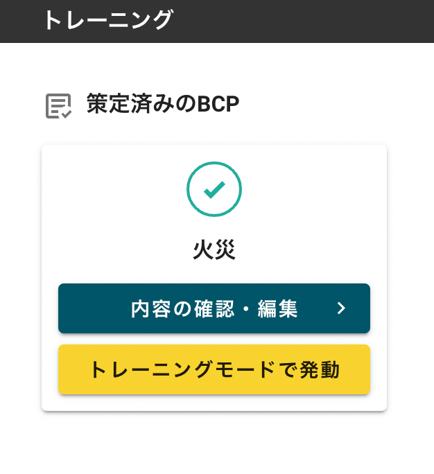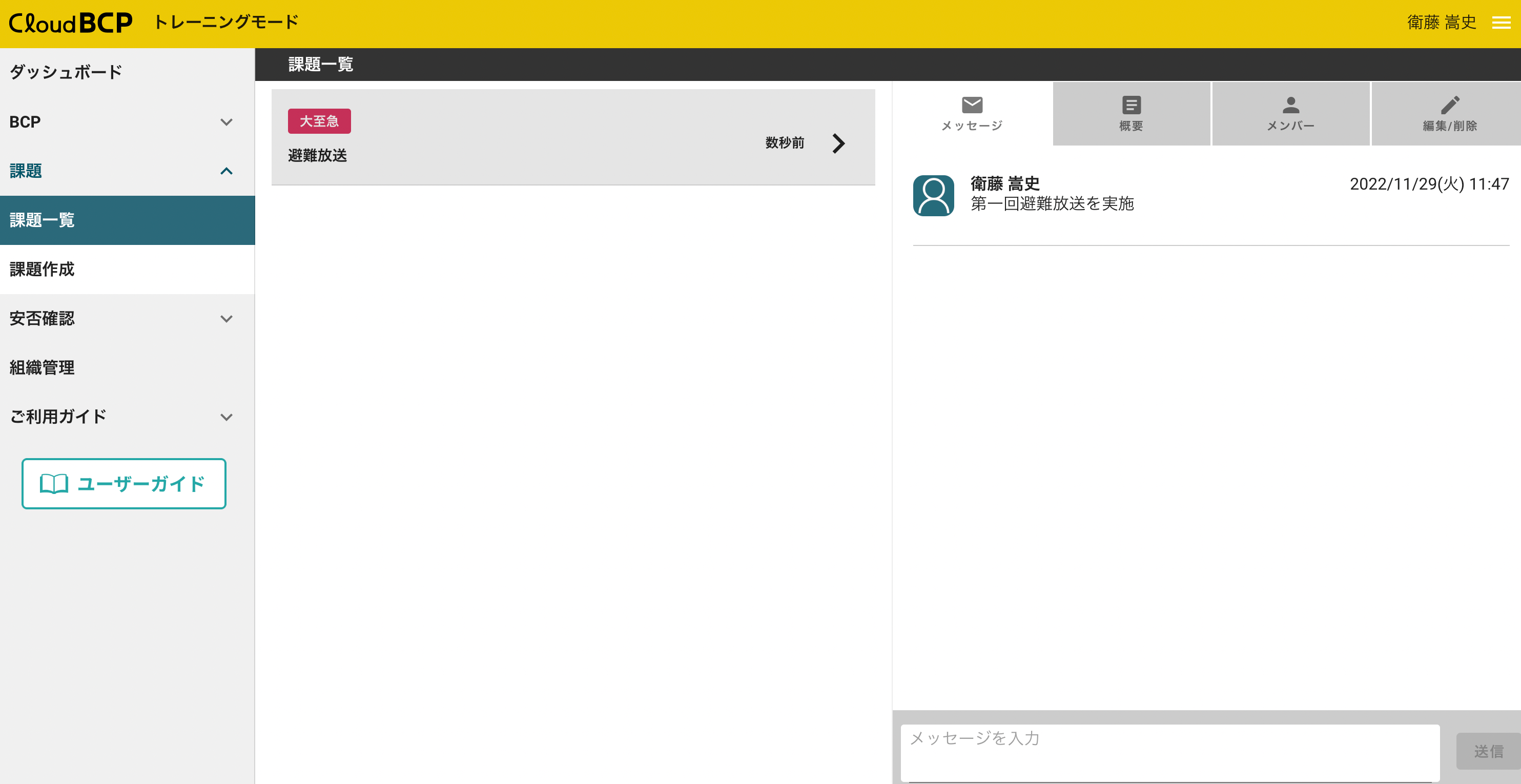 緊急時に役員・従業員の課題管理と進捗管理を訓練することができる機能。実際のBCPと紐付いた課題を各メンバーに配信することができ、本番さながらの訓練が行なえます。