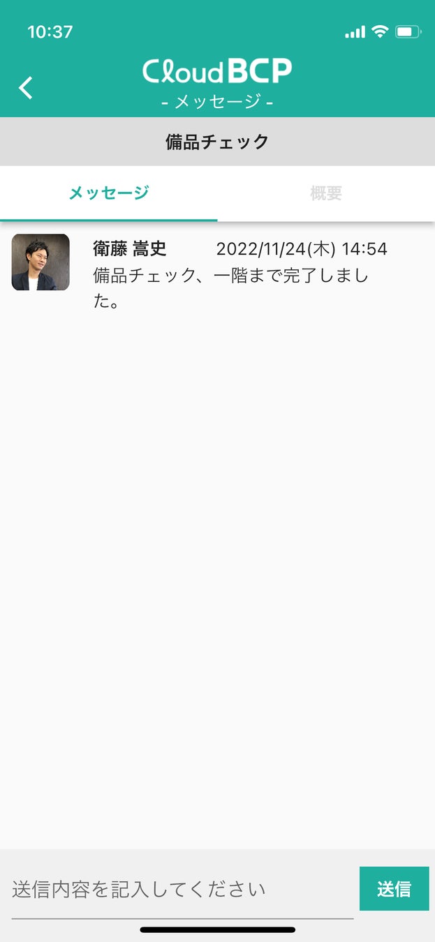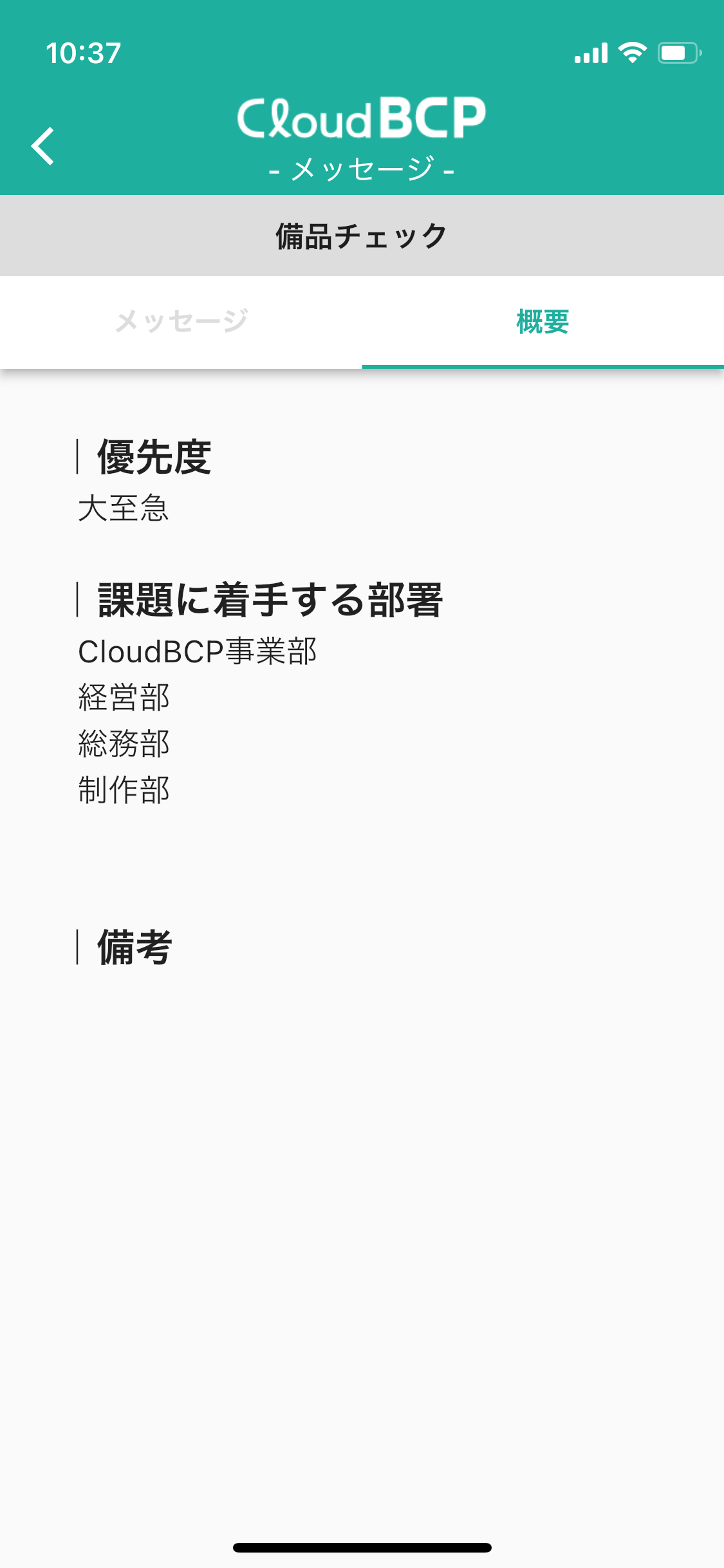 アクシデント発生時に企業の役員・従業員各々のタスクを一斉送信し、進捗状況を確認できる課題管理機能。専用のスマートフォンアプリをインストールする事で、自分がやるべきアクションが閲覧でき、また活動の履歴としてチャットを利用した進捗共有が行えます。課題は指定した部署に所属したメンバーのみ閲覧可能ですので、情報を制限、統制、整理できます。