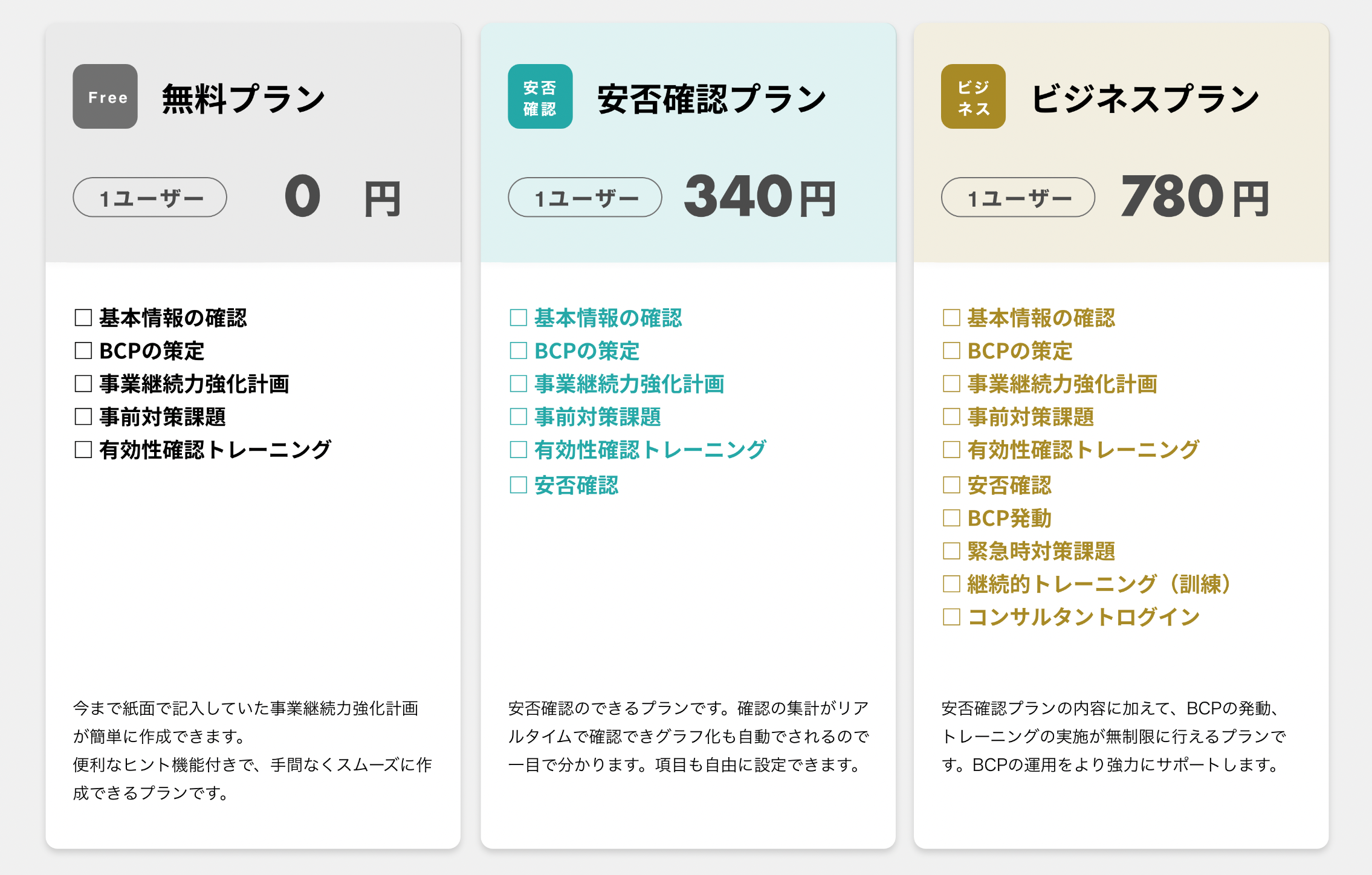 初期費用無料、従業員ユーザー単位の月額プランでのご利用。無料プラン・安否確認プランの全ての機能に加えて、課題管理機能・トレーニング機能を提供。BCPにとどまらず、BCMを行い、より実用性のあるBCP活動が行えます。
