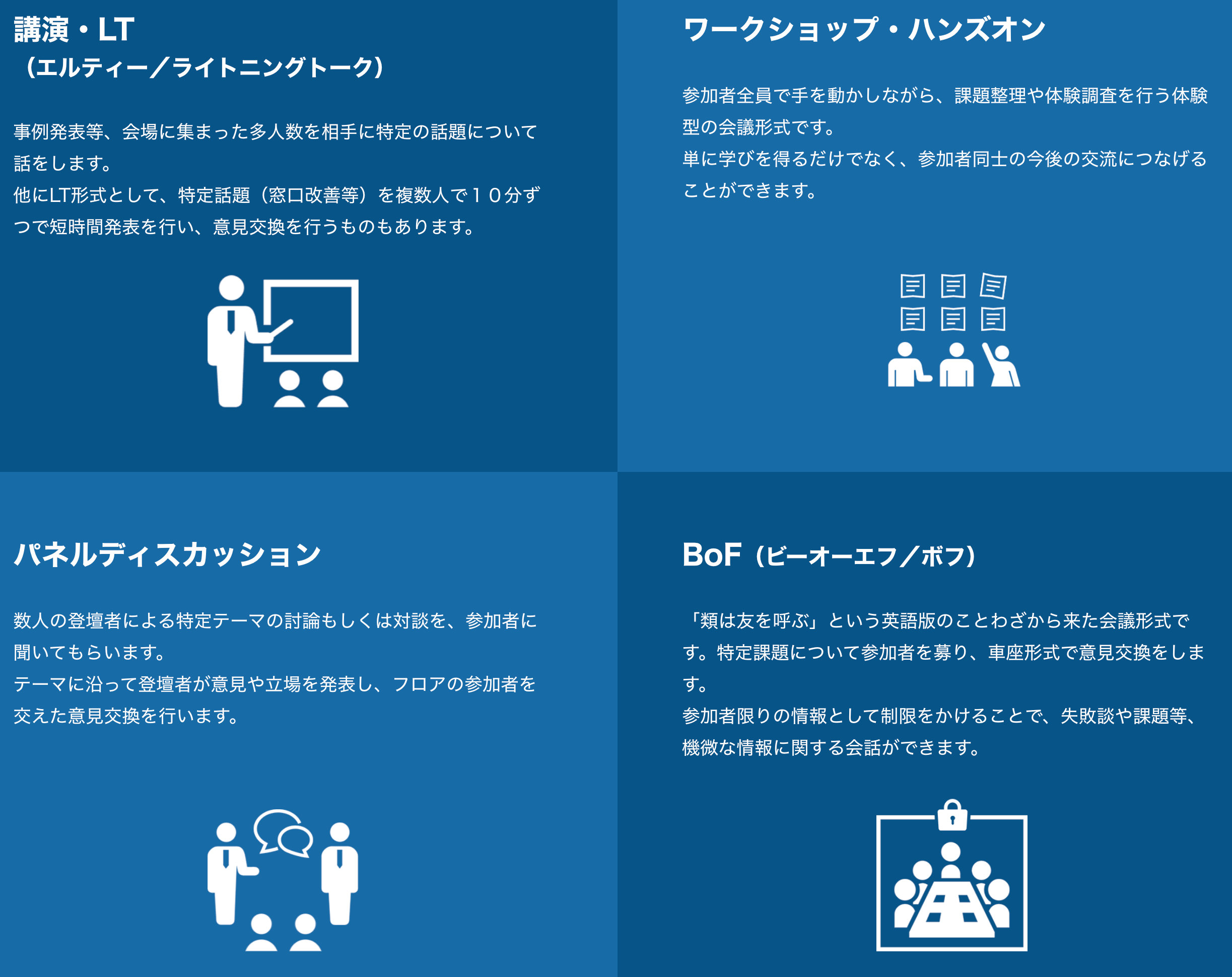 実行委員会企画、自治体職員からの公募企画で構成し、講演・LT、パネルディスカッション、BoFなど複数プログラムあります。プログラムは変更になる可能性がございます。