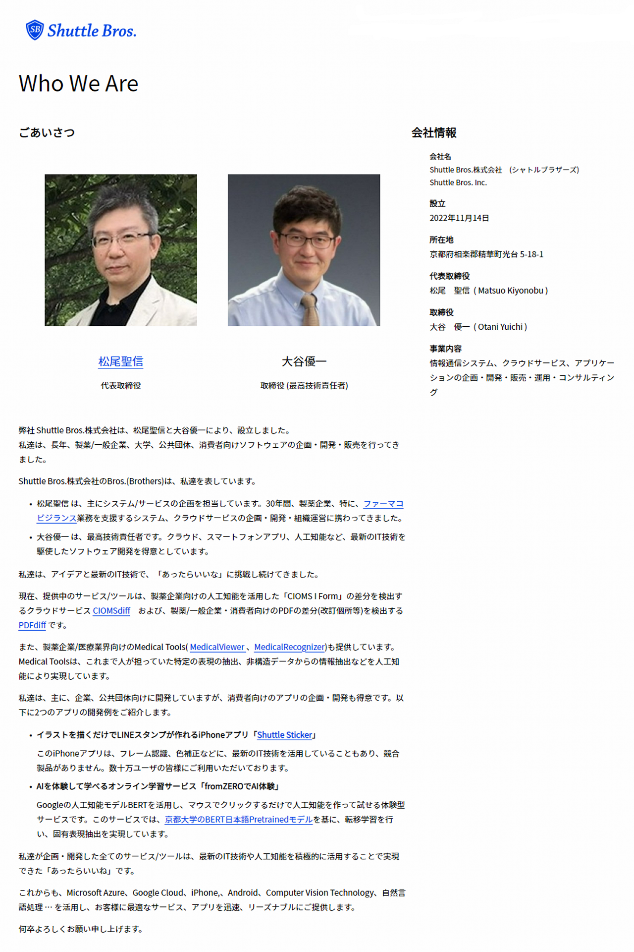 人手に頼りがちな【医薬・ファーマコビジランス(PV)】を人工知能で効率化する Shuttle Bros.株式会社(シャトルブラザーズ)は、2022年12月7日、「CIOMS I Form」の差分(変更・追加・削除)を人工知能で検出するクラウドサービス「CIOMSdiff」を開始しました。シャトルブラザーズは、2022年11月に2人のエンジニアにより設立されました。代表取締役(松尾聖信)は、30年間、PV業務を支援するソフトウェア・サービスの企画・開発を行ってきました。技術担当取締役(大谷優一)は、クラウド、iPhone/Androidアプリ、人工知能分野における最新技術を駆使した様々なソフトウェアの開発が専門です。豊富な経験と最新技術により「あったらいいな」を実現する Shuttle Bros.株式会社(シャトルブラザーズ)をご愛顧賜りますようお願い申し上げます。