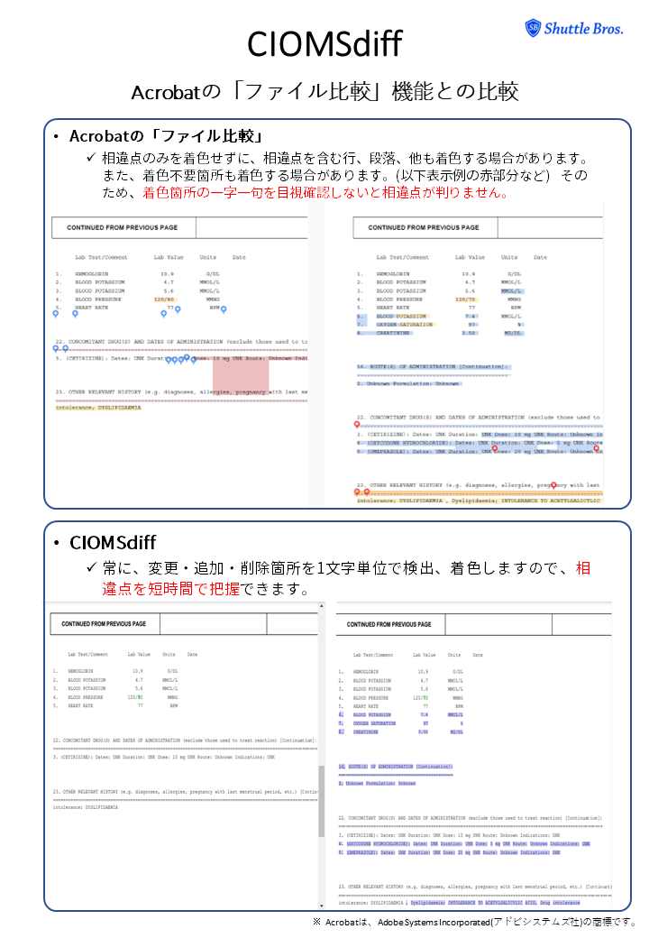 Shuttle Bros.株式会社(シャトルブラザーズ、本社:京都府、代表取締役(松尾聖信))は、2022年12月7日、「CIOMS I Form」の変更箇所を検出するクラウドサービス「CIOMSdiff」を開始しました。