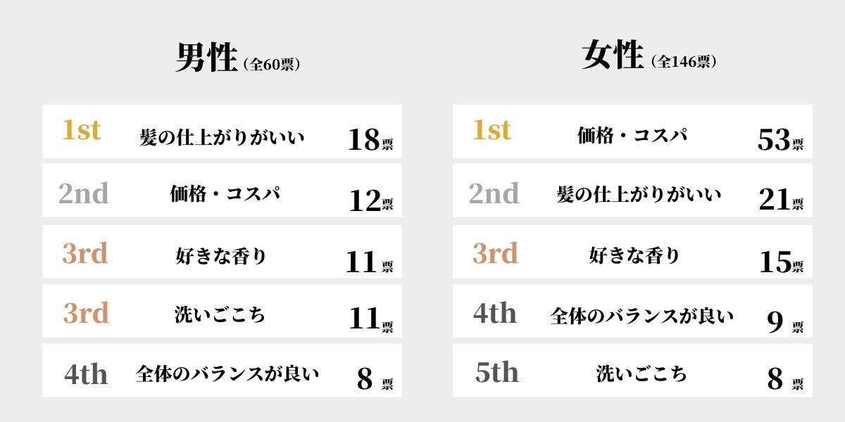 3位は好きな香り、4位は洗いごこち、5位は全体のバランスが良い、という結果でした。