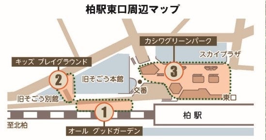 本空間は、「KASHIWA GREEN PARK」「All Good Garden」「Kids Playground」の3つのエリアで構成されます。