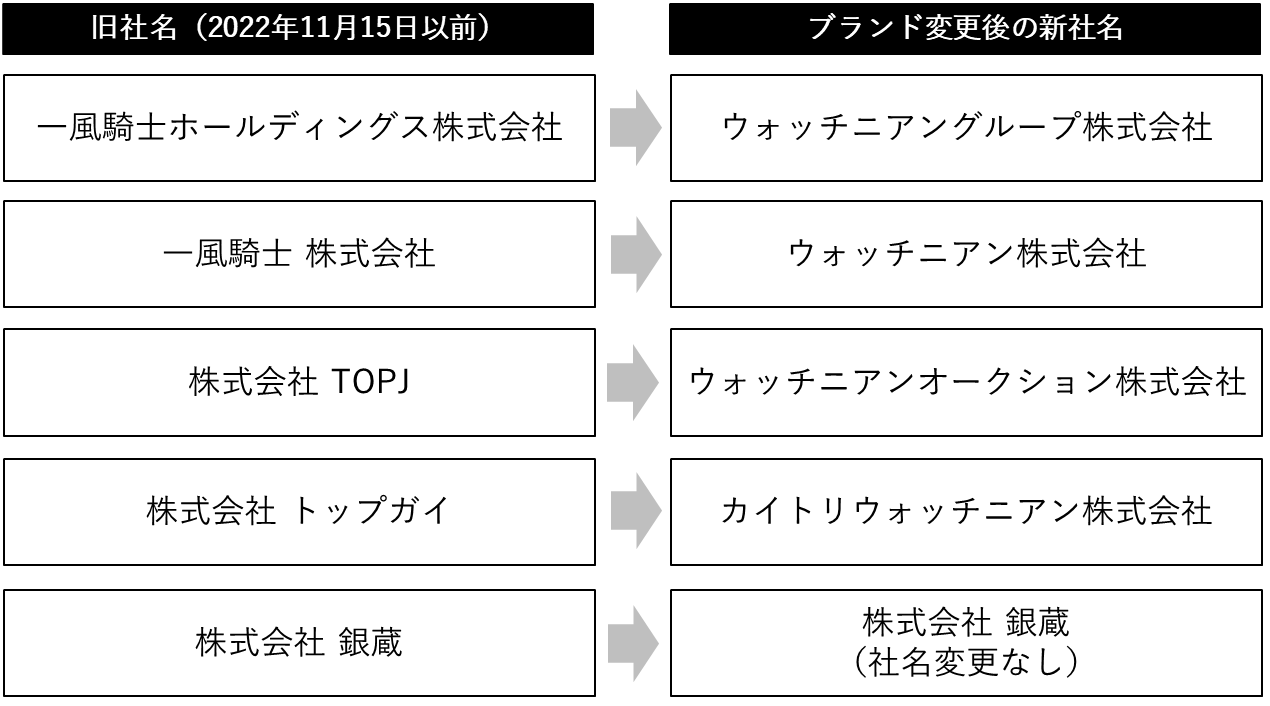 同時に持株会社である一風騎士ホールディングス株式会社は「ウォッチニアングループ株式会社」に、グループ会社でブランド品オークション運営大手のTOP Jは「ウォッチニアンオークション株式会社」に、グループ会社でブランド品買取大手のトップガイは「カイトリウォッチニアン株式会社」に、それぞれ社名を変更しています。