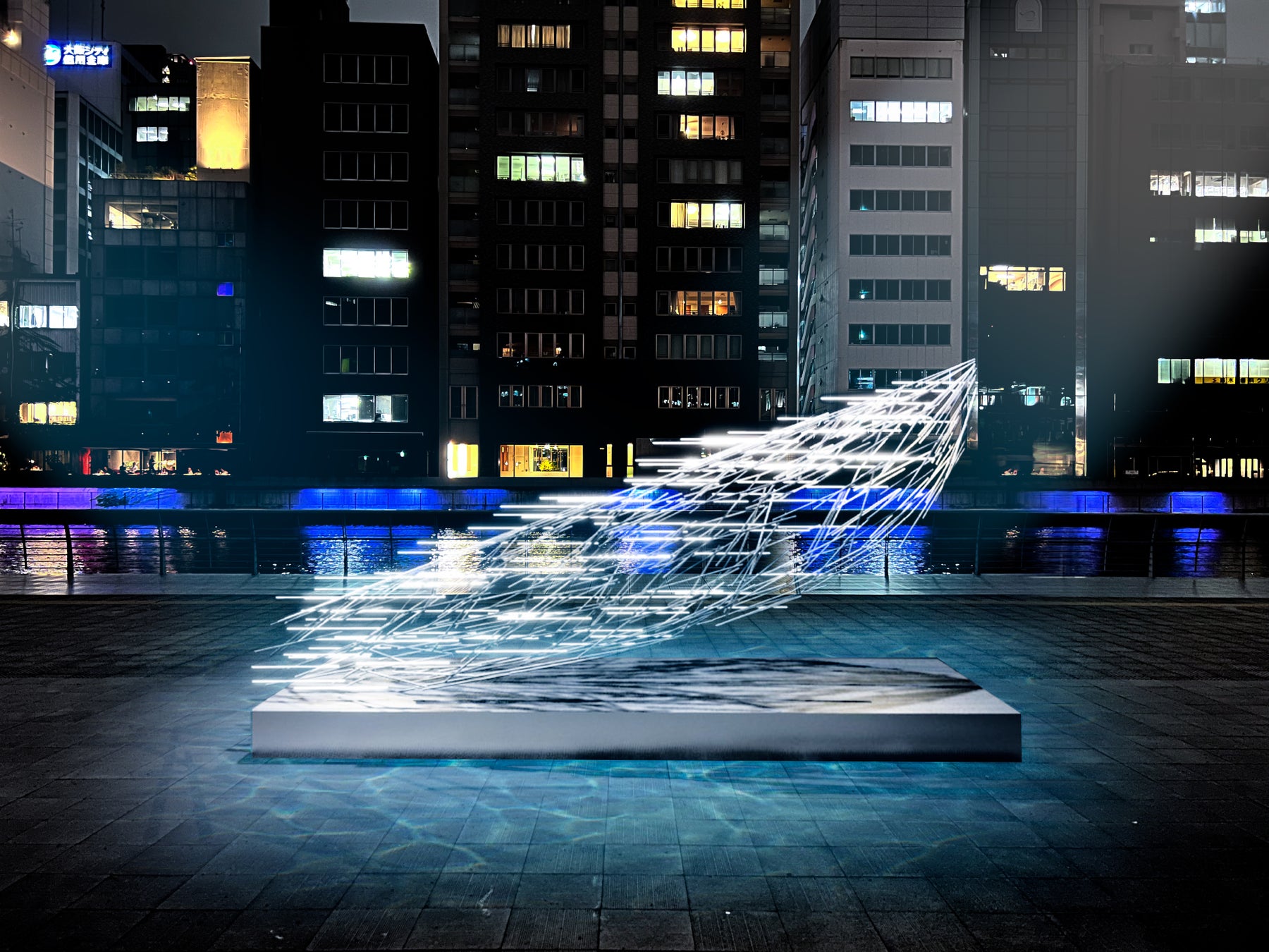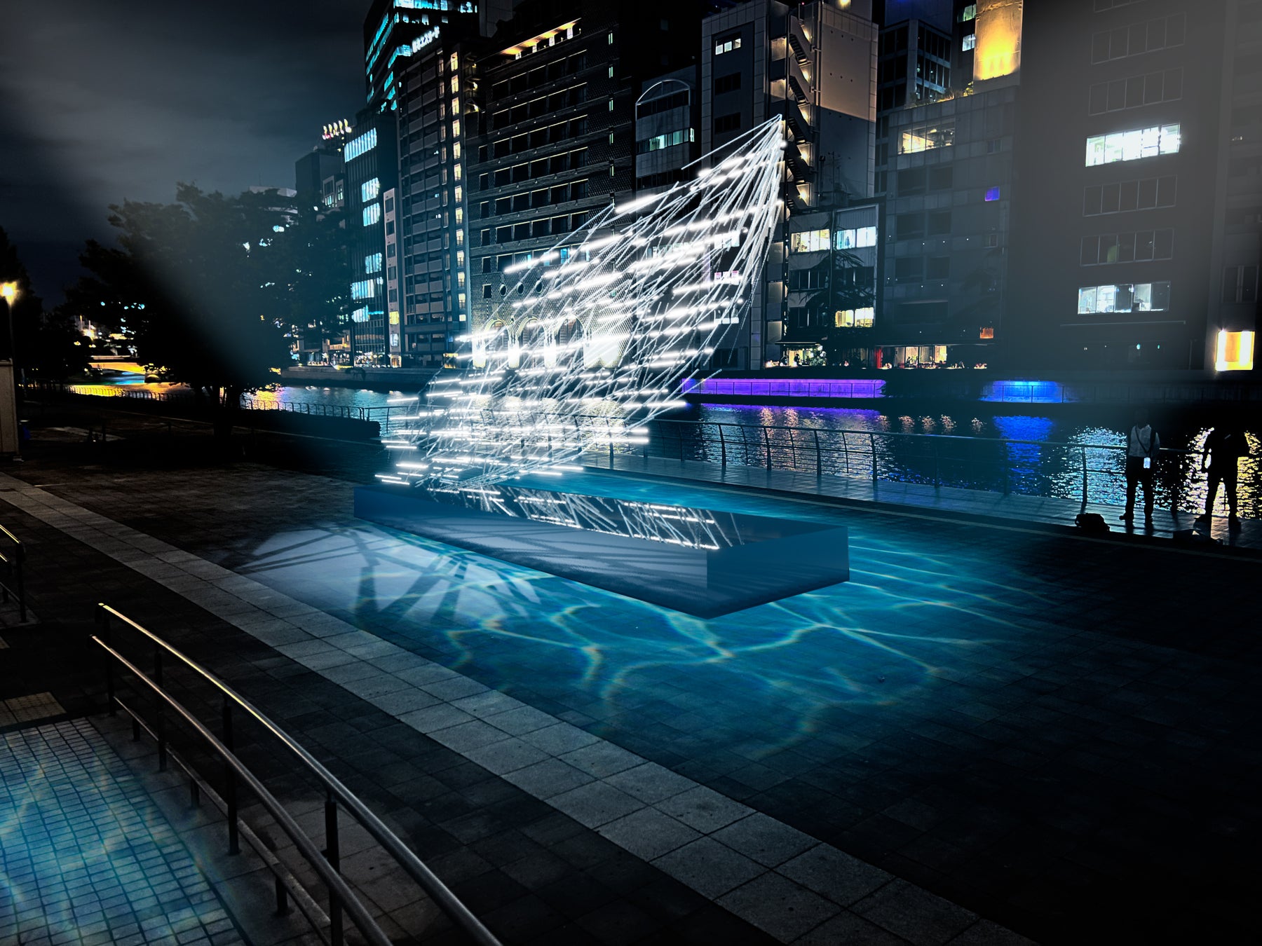 架けられた橋々をモチーフに、鉄と光の線で象られた船には、水辺の景色や行き交う人々が映り交わり、かつての「八百八橋」のように、水辺と人と街の関係を繋ぎます。