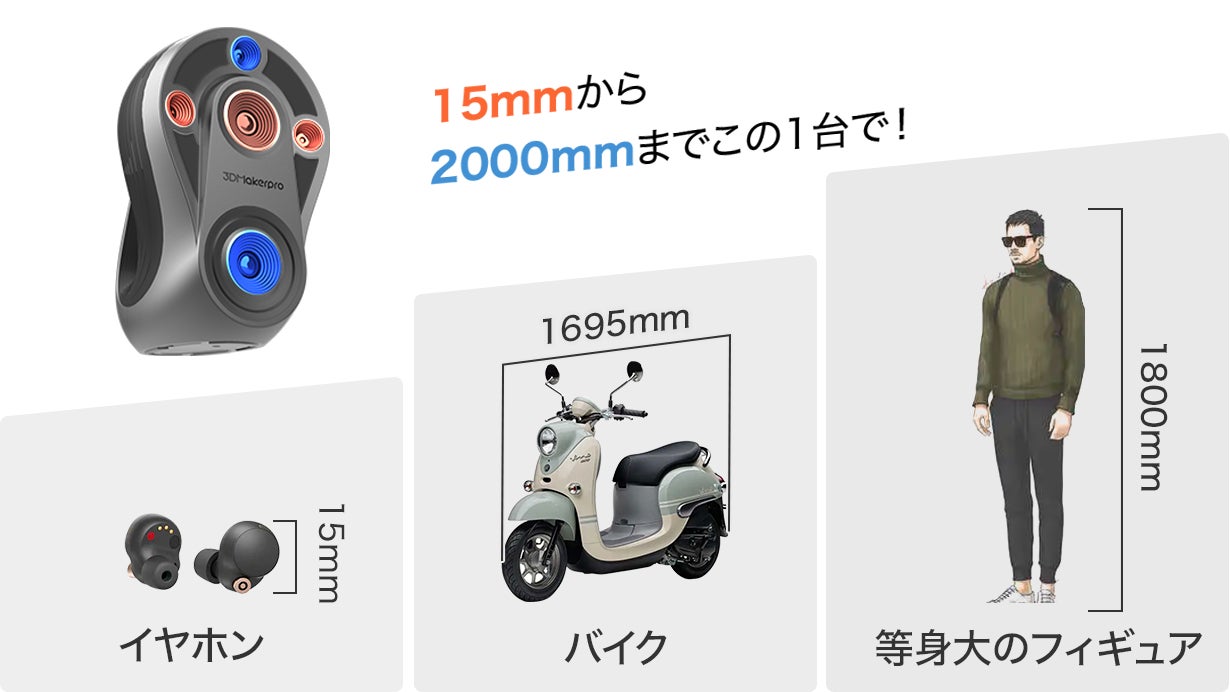 一度のスキャンで15mmほどの小さなイヤホンから、2mほどの大きなバイクまで対応が可能になりました。これまでは対象物のサイズに合わせて2種類のスキャナーを使い分けなければなりませんでしたが、このWhale1台あれば身の回りのものほとんどが対応可能です。