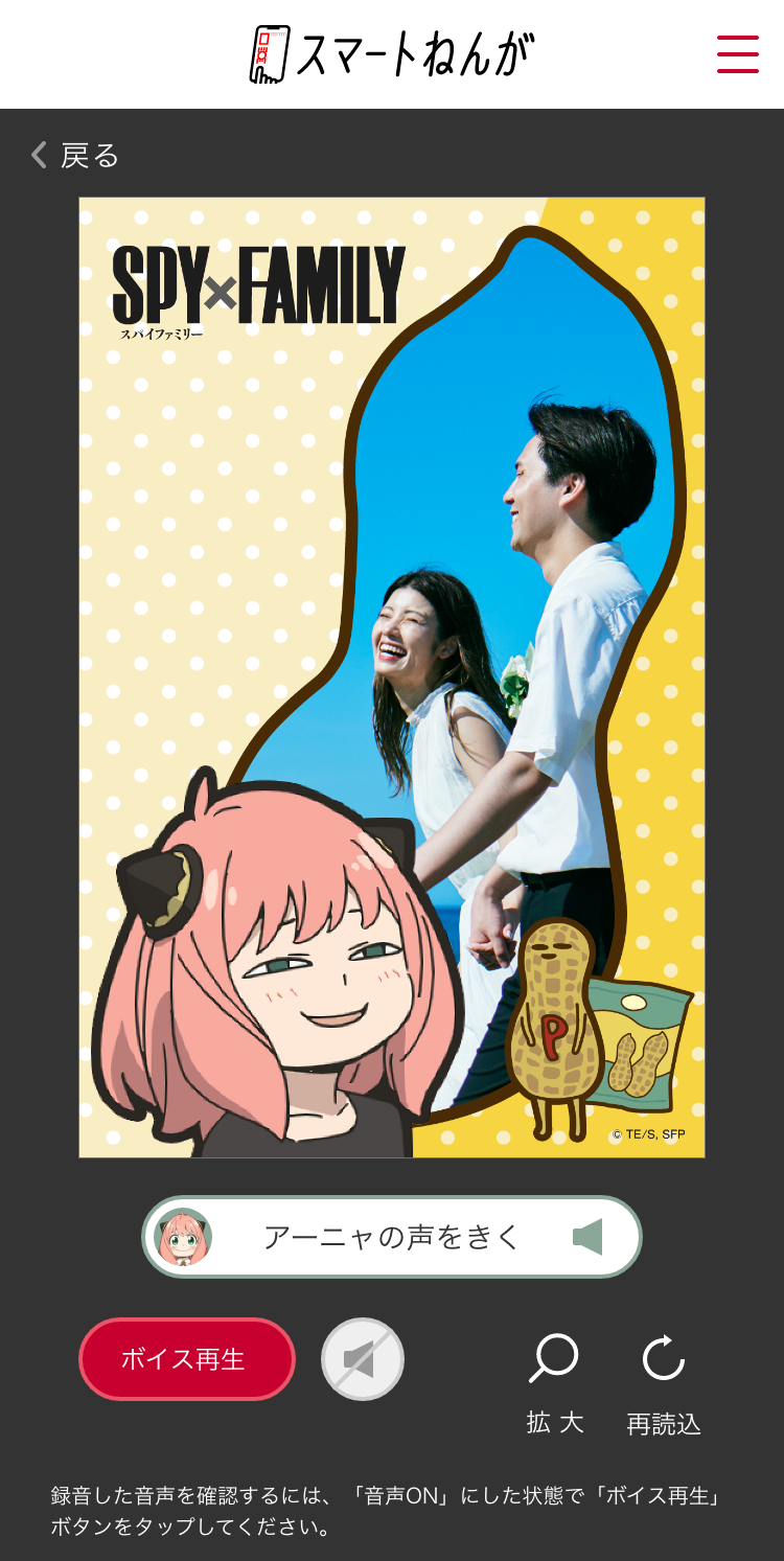 ※スマートねんがの操作画面にある「アーニャの声をきく」というボタンを押すと、ボイス再生されます。