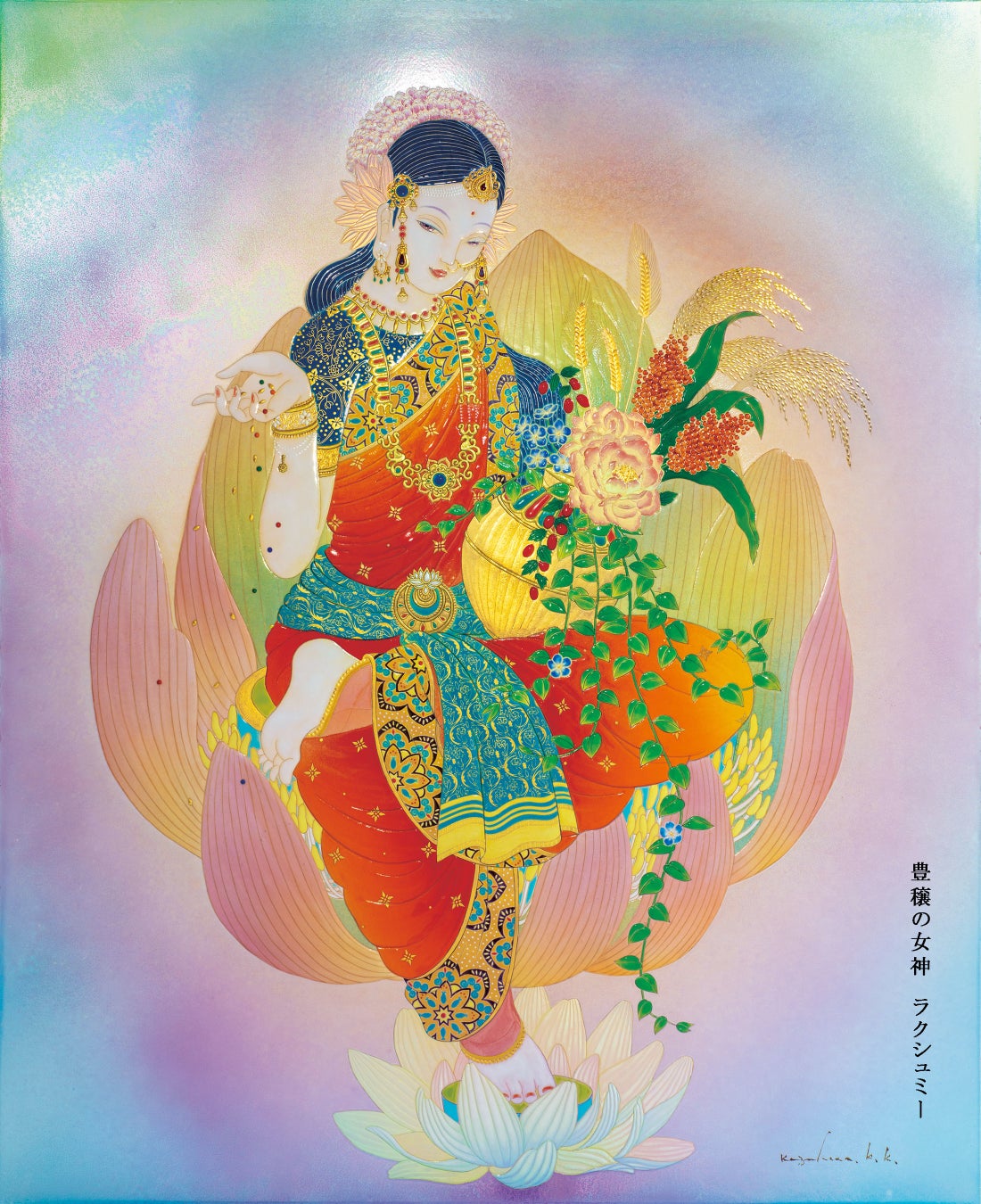 美・富・豊穣、そして幸運を司るインドの女神を描いた作品『豊穣の女神 ラクシュミー』。インドでは豊かさをもたらす神として金銀財宝が散りばめられた構図が多く用いられますが、作家は敢えて「金銀財宝」に代わり「種子」が溢れる様を描きました。