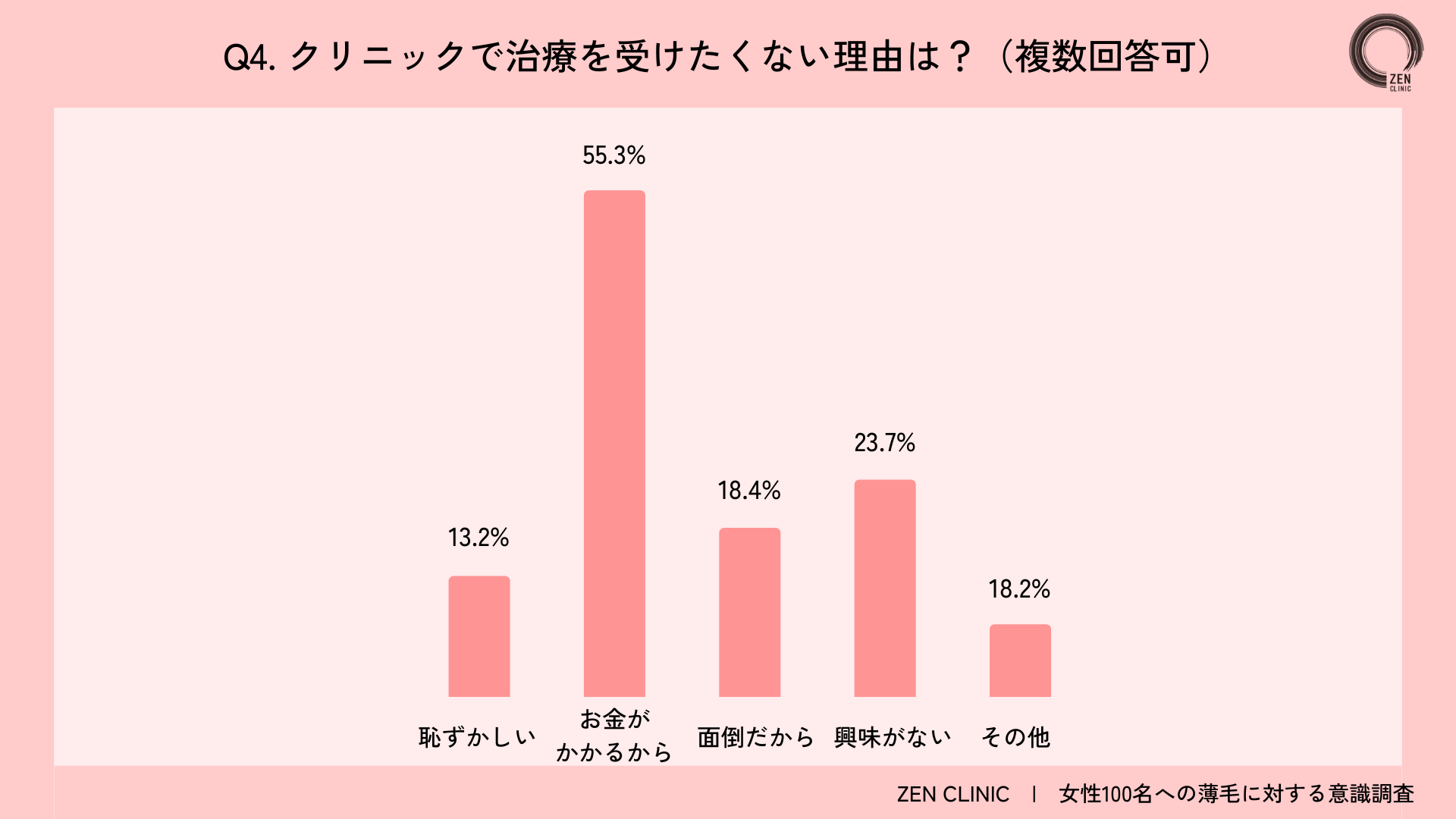 7割以上の女性が「薄毛になってしまったらクリニックの薄毛治療を受けたい」と回答している中で、「クリニック治療を受けたくない」という方の理由として最も多かったのは、「お金がかかるから」という理由でした。